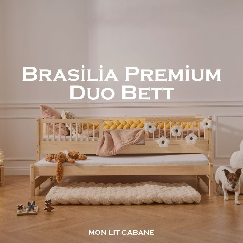 - Lit Brasilia Duo: eine durchdachte und elegante Schlaflösung für wachsende Kinder. Entwickelt für eine 90 × 190 cm‑Matratze im Hauptbett und 90 × 180 cm im Ausziehbett, bietet es eine praktische zweite Schlafgelegenheit unter dem Hauptbett – ideal für Pyjama‑Nächte oder Geschwister.