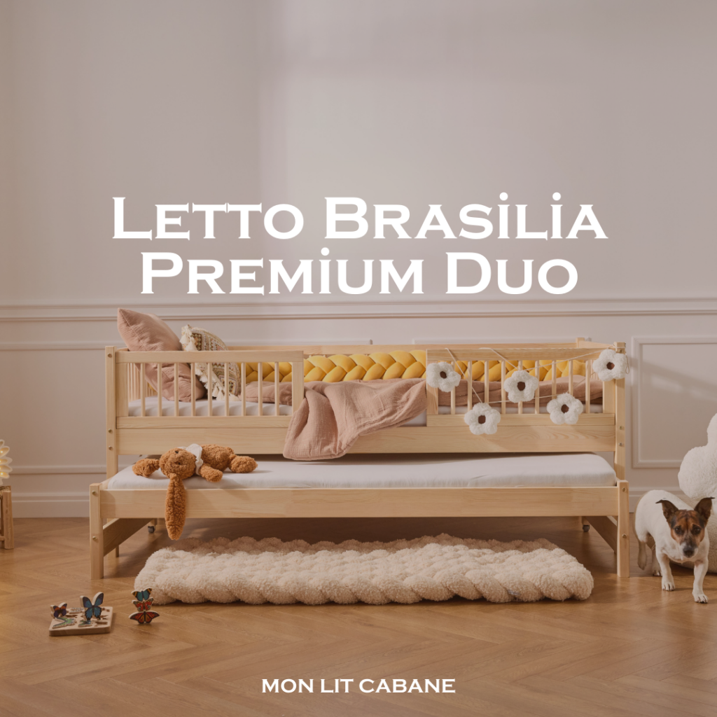 - Letto Brasilia Duo: una soluzione di dormita ingegnosa ed elegante per i bambini che crescono. Progettato per ospitare un materasso 90 × 190 cm nel letto principale e 90 × 180 cm nel letto estraibile, offre un secondo spazio letto pratico sotto il letto principale, ideale per serate di pigiama o per fratelli e sorelle.