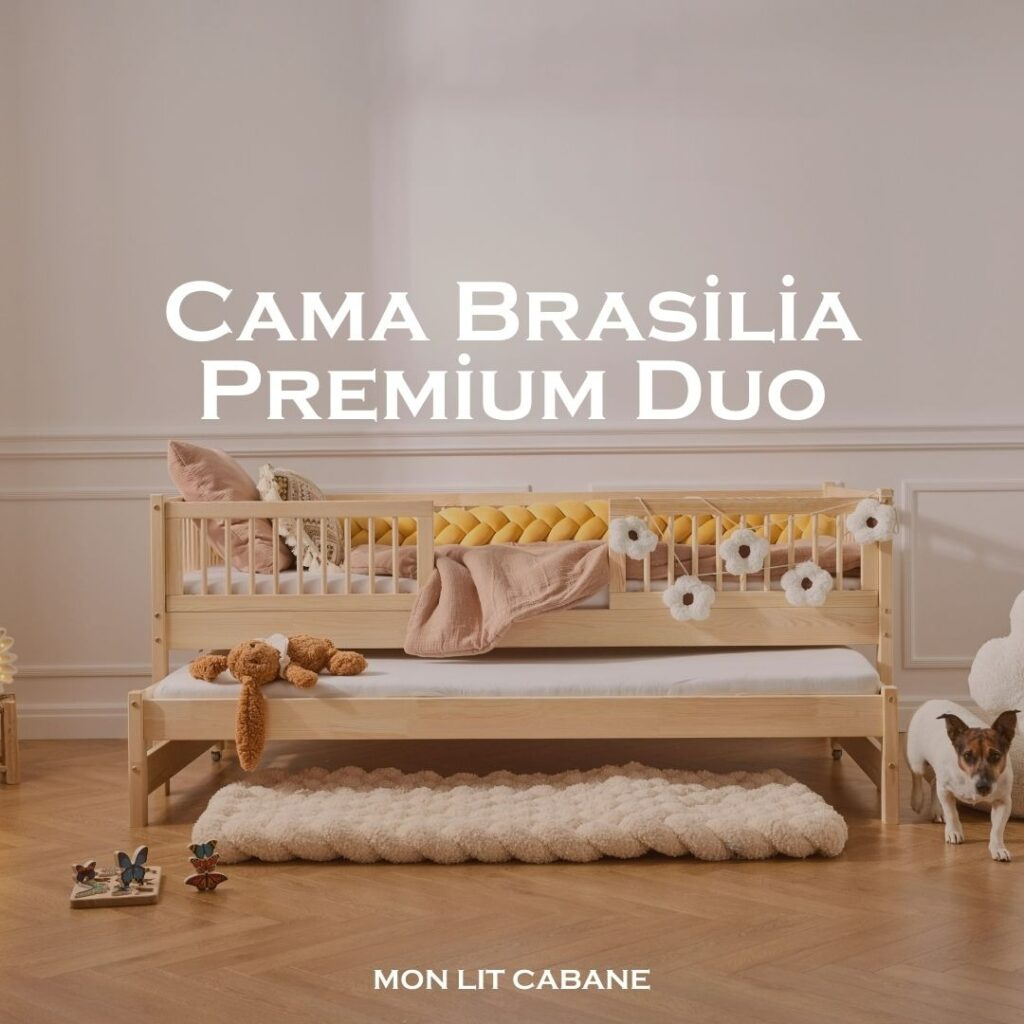 - Cama Brasilia Duo: uma solução de dormitório engenhosa e elegante para crianças em crescimento. Projetada para acolher um colchão de 90 × 190 cm na cama principal e 90 × 180 cm na cama extra, oferece um segundo espaço de descanso prático sob a cama principal, ideal para noites de pijama ou irmãos e irmãs.