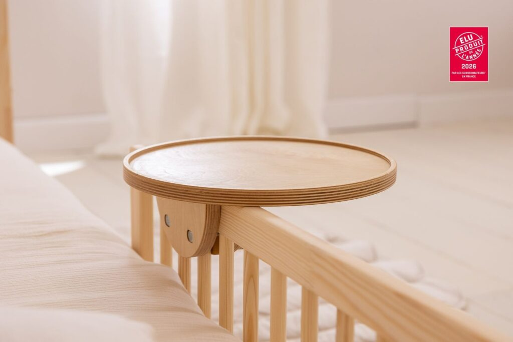 Um pequeno detalhe que faz toda a diferença. Ao mesmo tempo prática e decorativa, a mesinha de cabeceira redonda, fixada à grade da cama, permite ter ao alcance da mão um livro, uma luz noturna ou um pequeno tesouro. Um acessório inovador e funcional, pensado para acompanhar os rituais da noite e o dia a dia.
