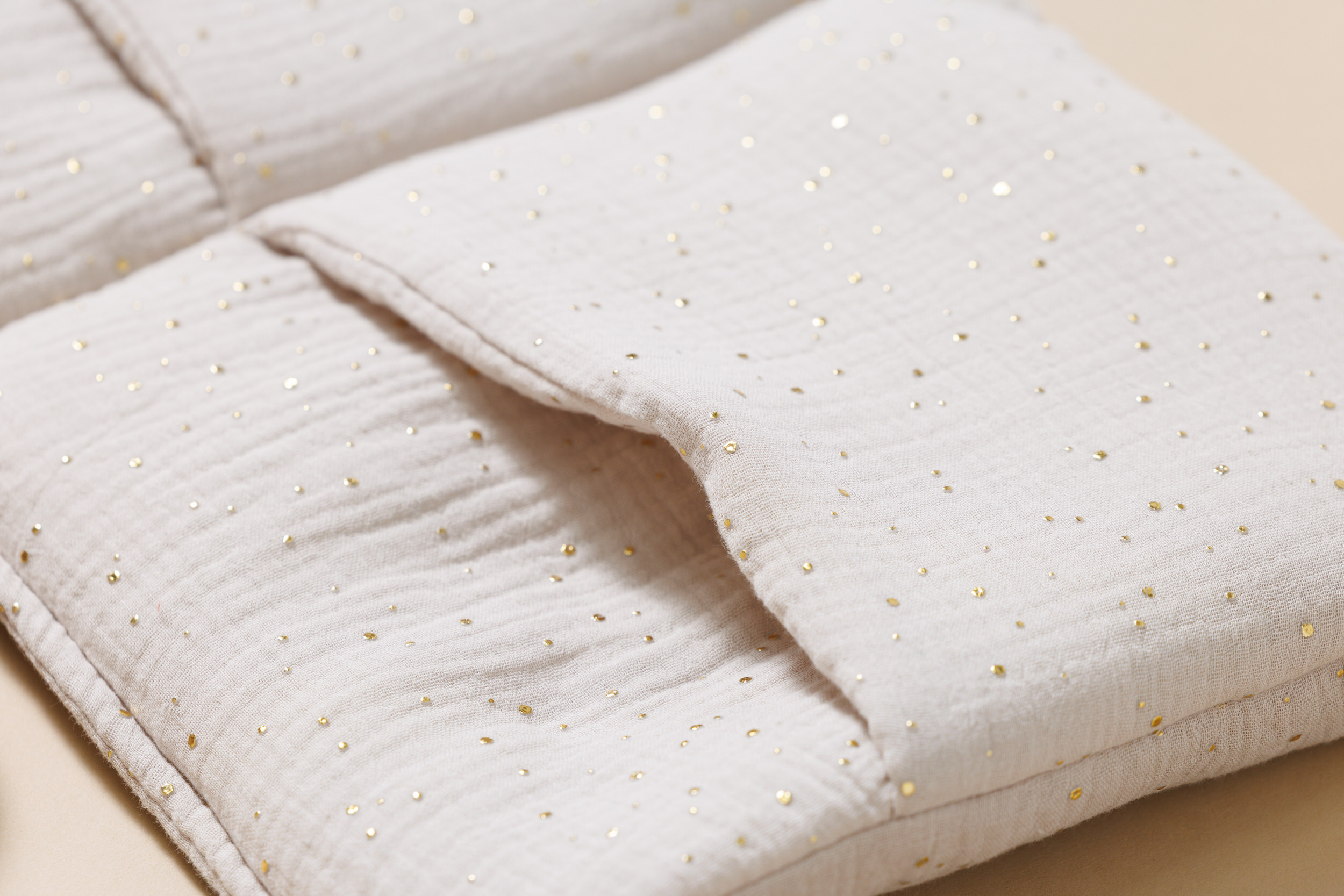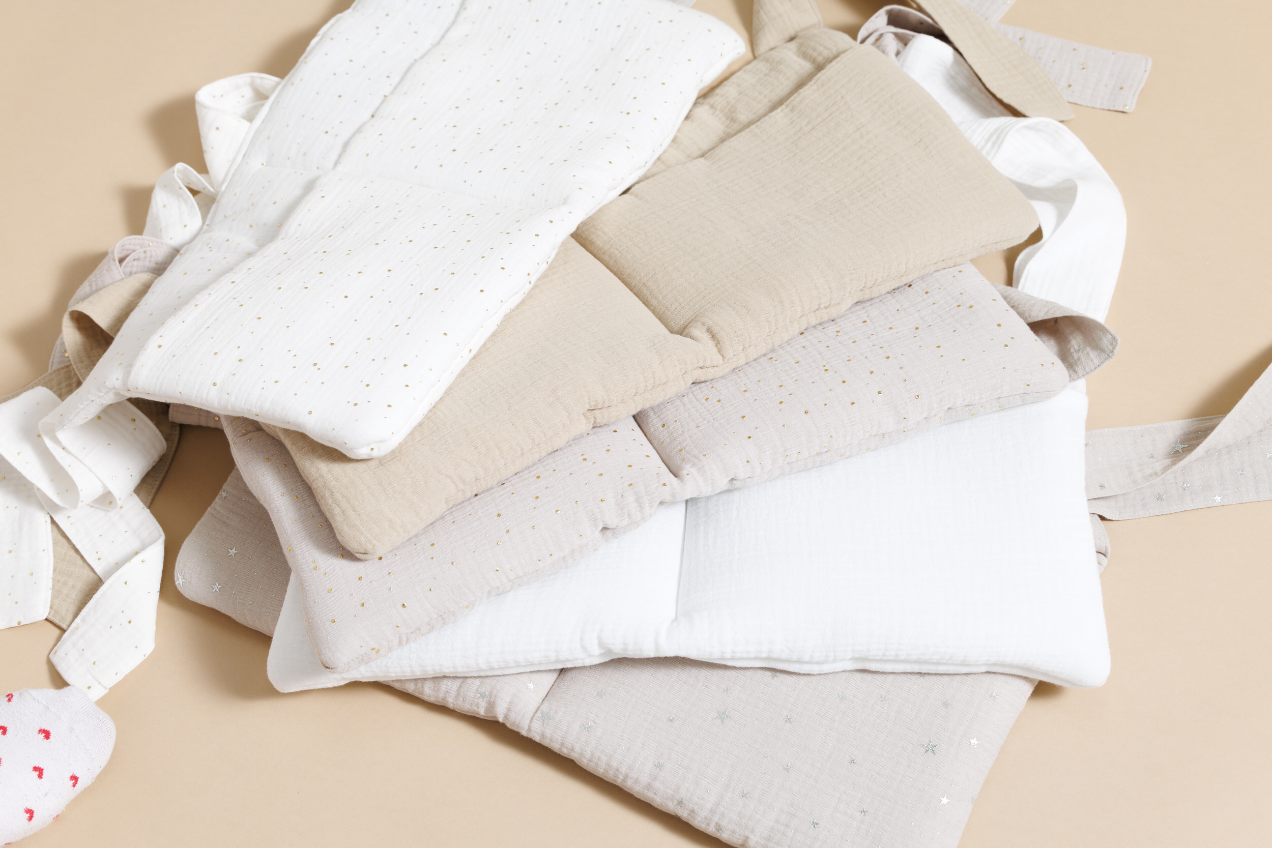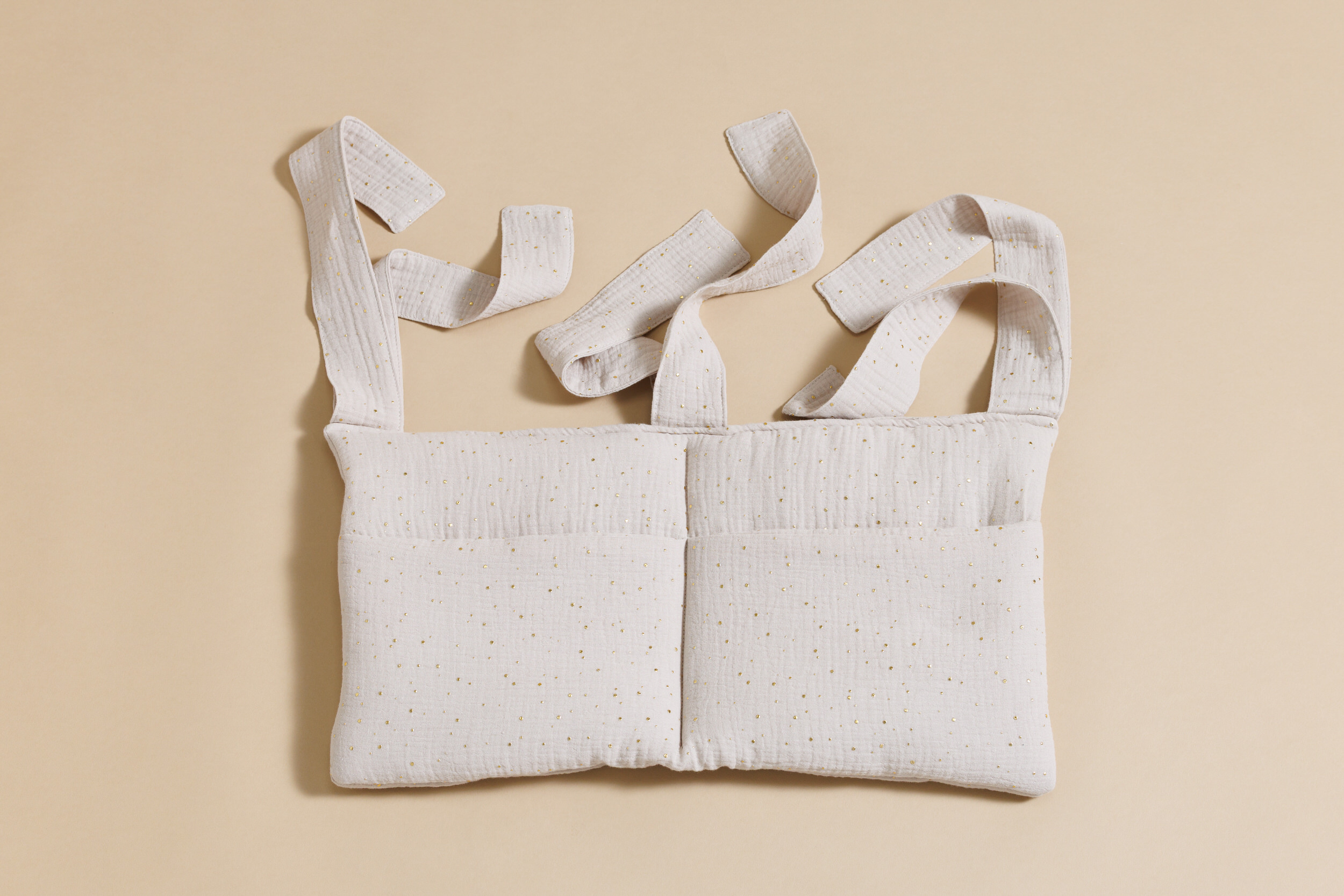 Sie wird mit kleinen Bändern an den Gitterstäben des Bettes befestigt und ist ein schönes dekoratives Element. In den 2 tiefen Taschen lassen sich Schlafanzüge, Babyflaschen und Bücher leicht verstauen.