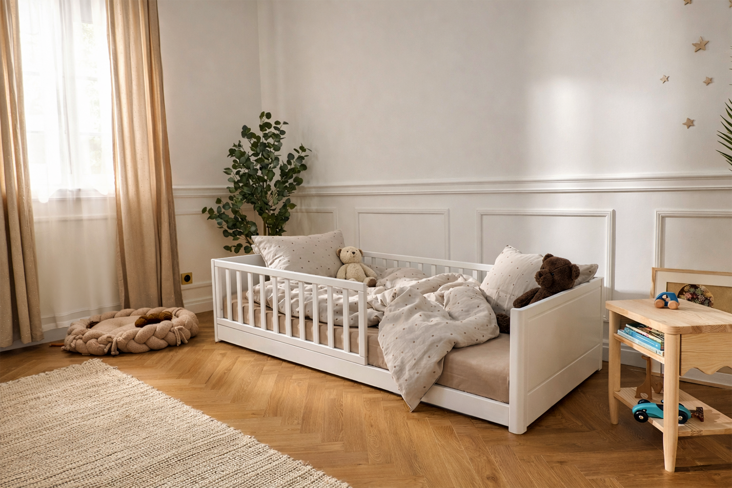 Es steht direkt auf dem Boden, sodass Ihr Kind das Bett frei betreten und verlassen kann. Dies ist die perfekte Lösung für Kleinkinder, die ihre Unabhängigkeit erlernen und die Welt auf ihre eigene Weise erkunden. Das niedrige Profil minimiert die Sturzgefahr und sorgt gleichzeitig für einen komfortablen Schlaf. Abgerundete Kanten und eine stabile Struktur aus hochwertigen Materialien gewährleisten zusätzliche Sicherheit.
