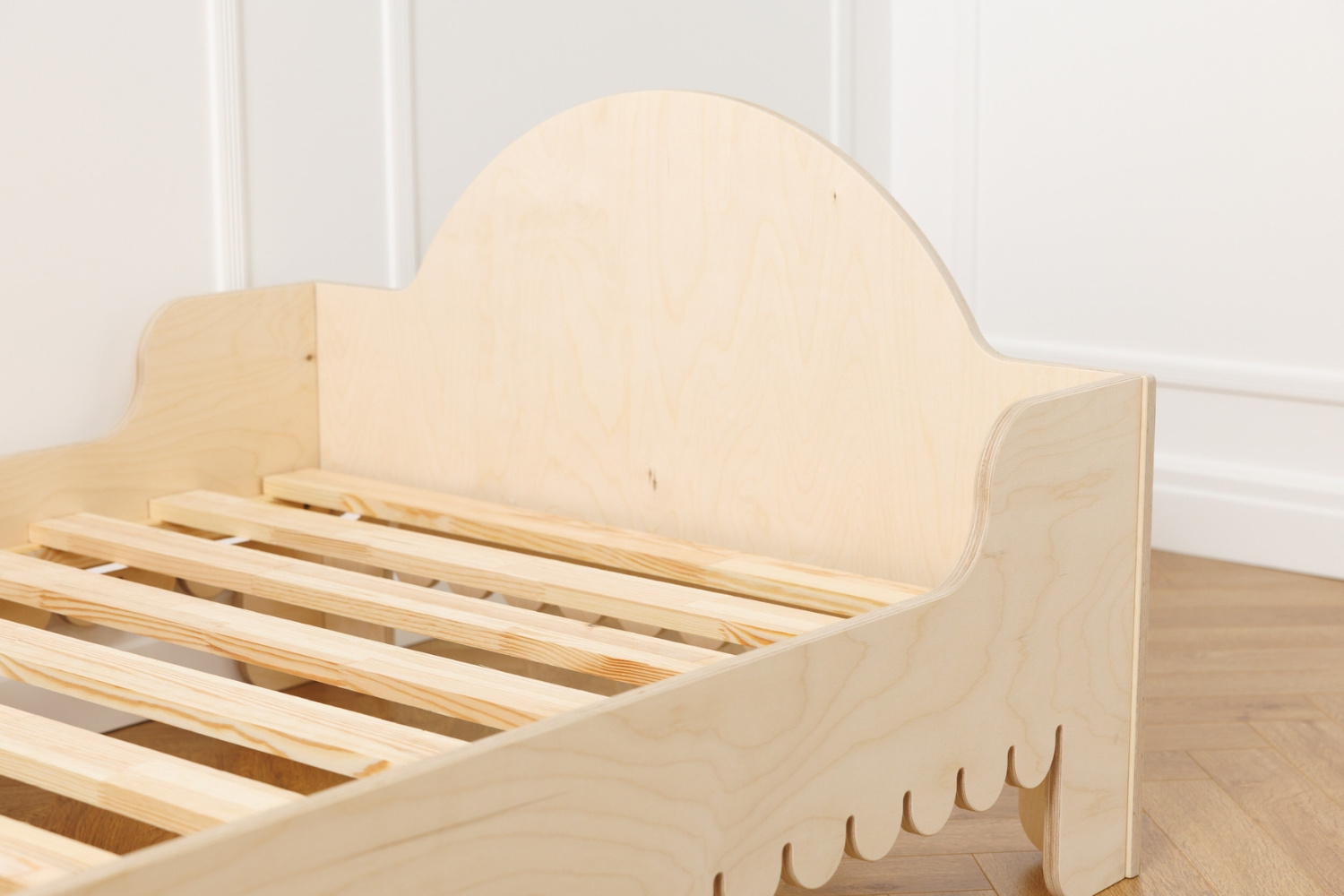 Dieses Einzelbett zeichnet sich durch seine wellenförmigen Konturen aus, die an die Bewegungen des Meeres erinnern.