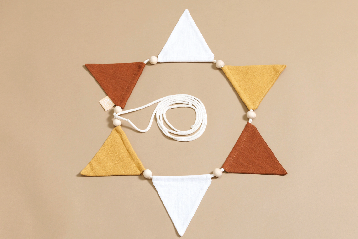 Diese Girlande besteht aus 6 Dreiecken, die an einem Baumwollfaden hängen und durch Holzperlen getrennt sind.