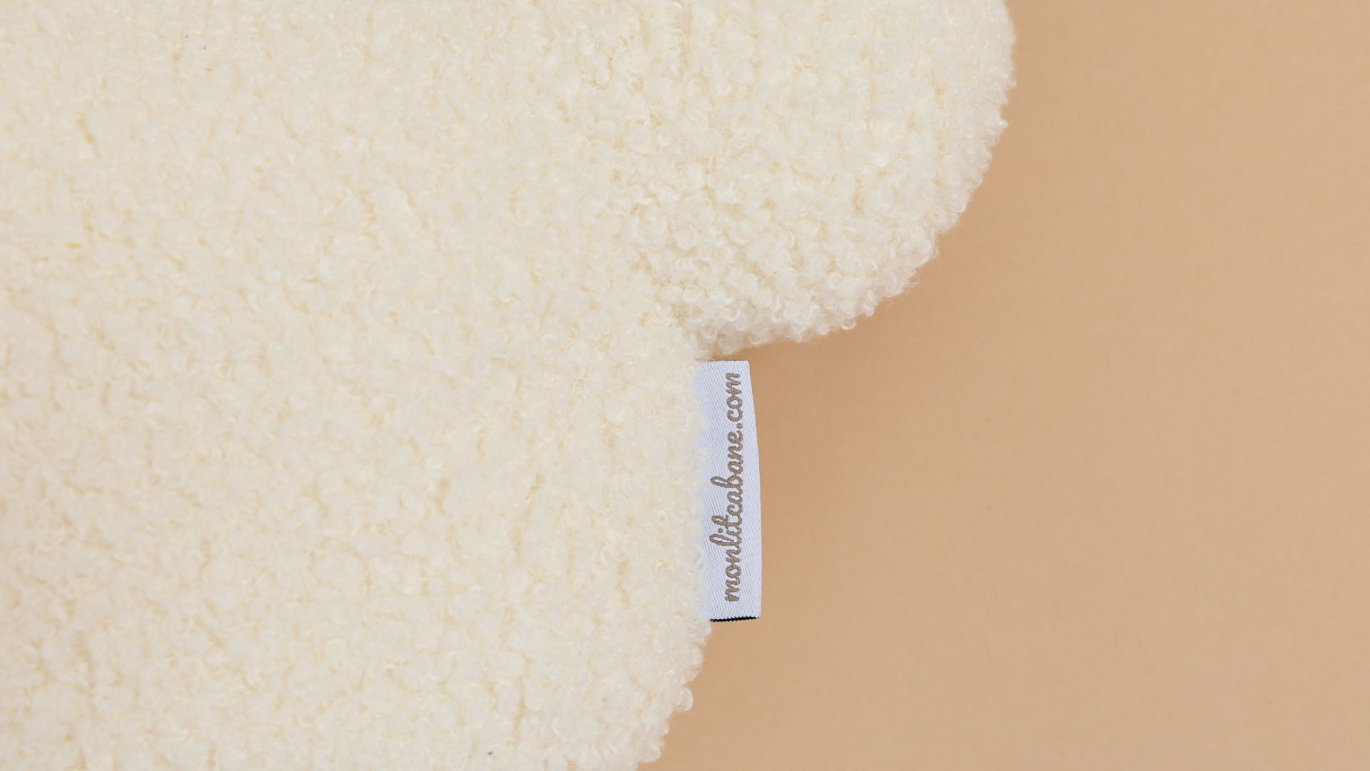 Handgefertigt, gestrickter Bouclé-Stoff mit Lammfell-ähnlicher Haptik, 100 % Polyester und Oeko-Tex 100 zertifiziert.