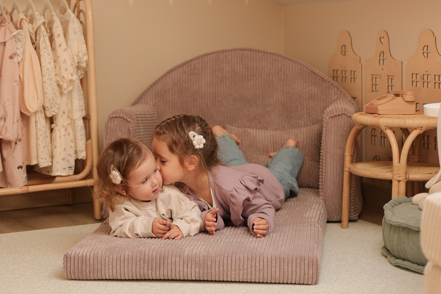 Dieses Mini-Sofa besteht aus hochdichtem Schaumstoff und ist mit Cord-Velours bezogen. Eine Seitentasche ermöglicht die Aufbewahrung kleiner Gegenstände, wie eines ersten Buches. Dank seiner Breite können zwei Kinder bequem sitzen, und die ausklappbare Funktion ist ideal zum Spielen oder für ein Nickerchen.
