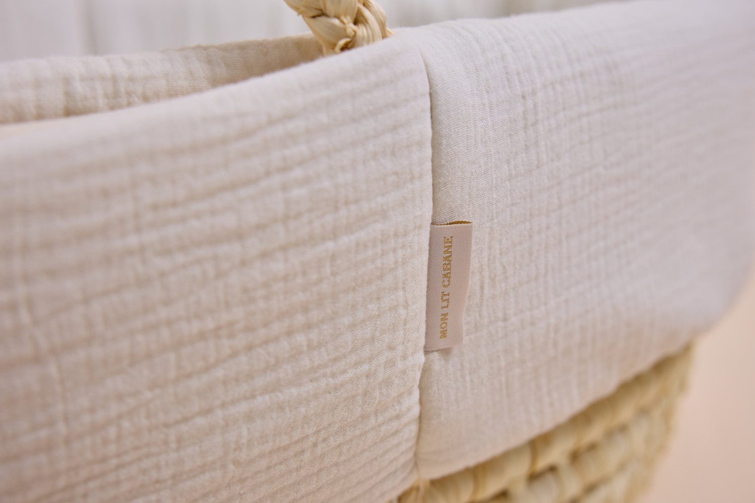 Baumwoll-Musselin-Futter, ideal an den Moseskorb angepasst dank des eingenähten Gummizugs an den Rändern.