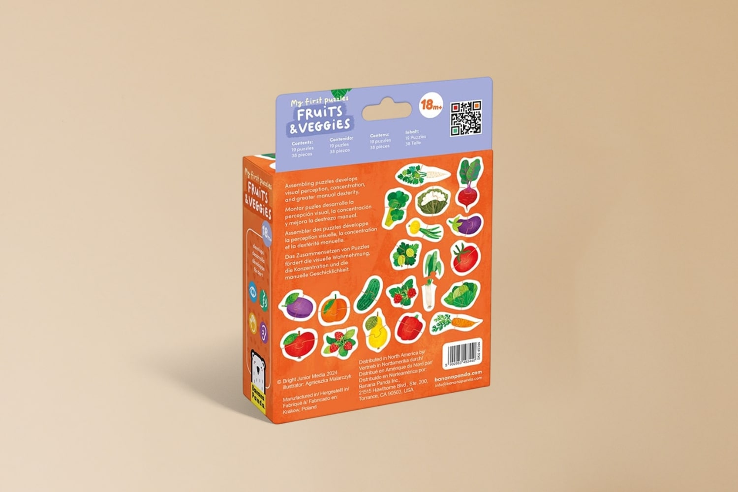 Im Set befinden sich 19 Puzzles mit zwei Teilen, die Illustrationen von Lieblingsfrüchten und -gemüsen zeigen.