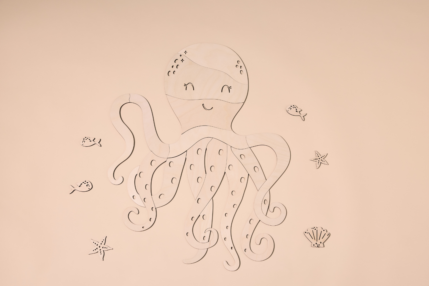 Bringen Sie mit diesem charmanten Oktopus aus Holz die Magie der Meereswelt in das Zimmer Ihres Kindes – eine süße und elegante Ergänzung für jede Einrichtung im Meeresstil.
