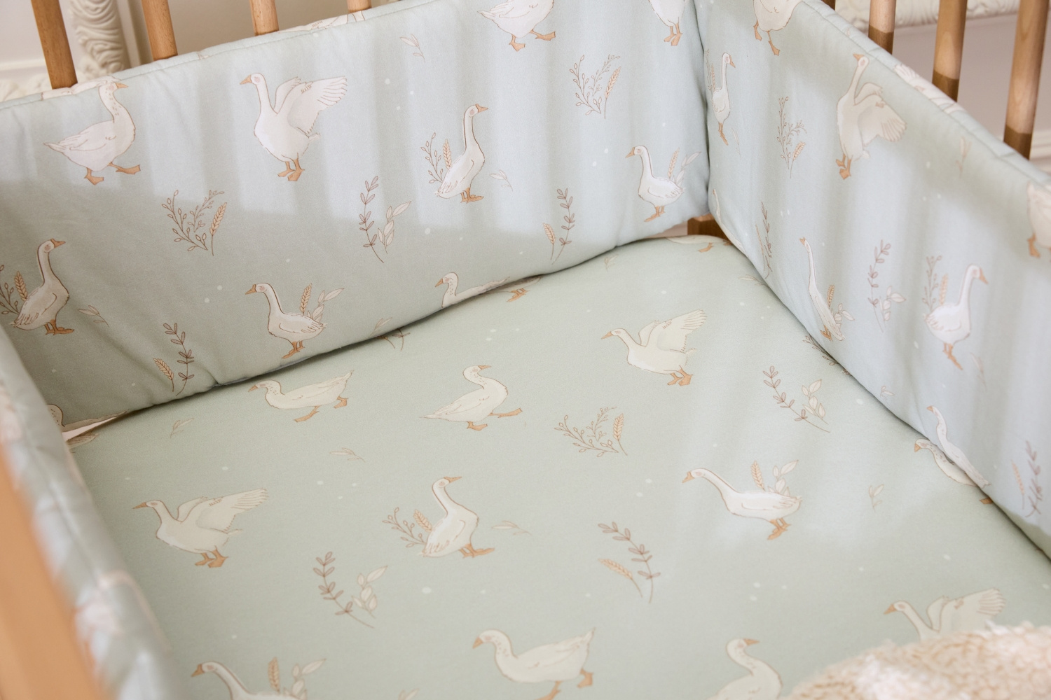 The high-quality 400 g/m² non-woven filling is hypoallergenic and provides adequate protection against the bars of the crib.