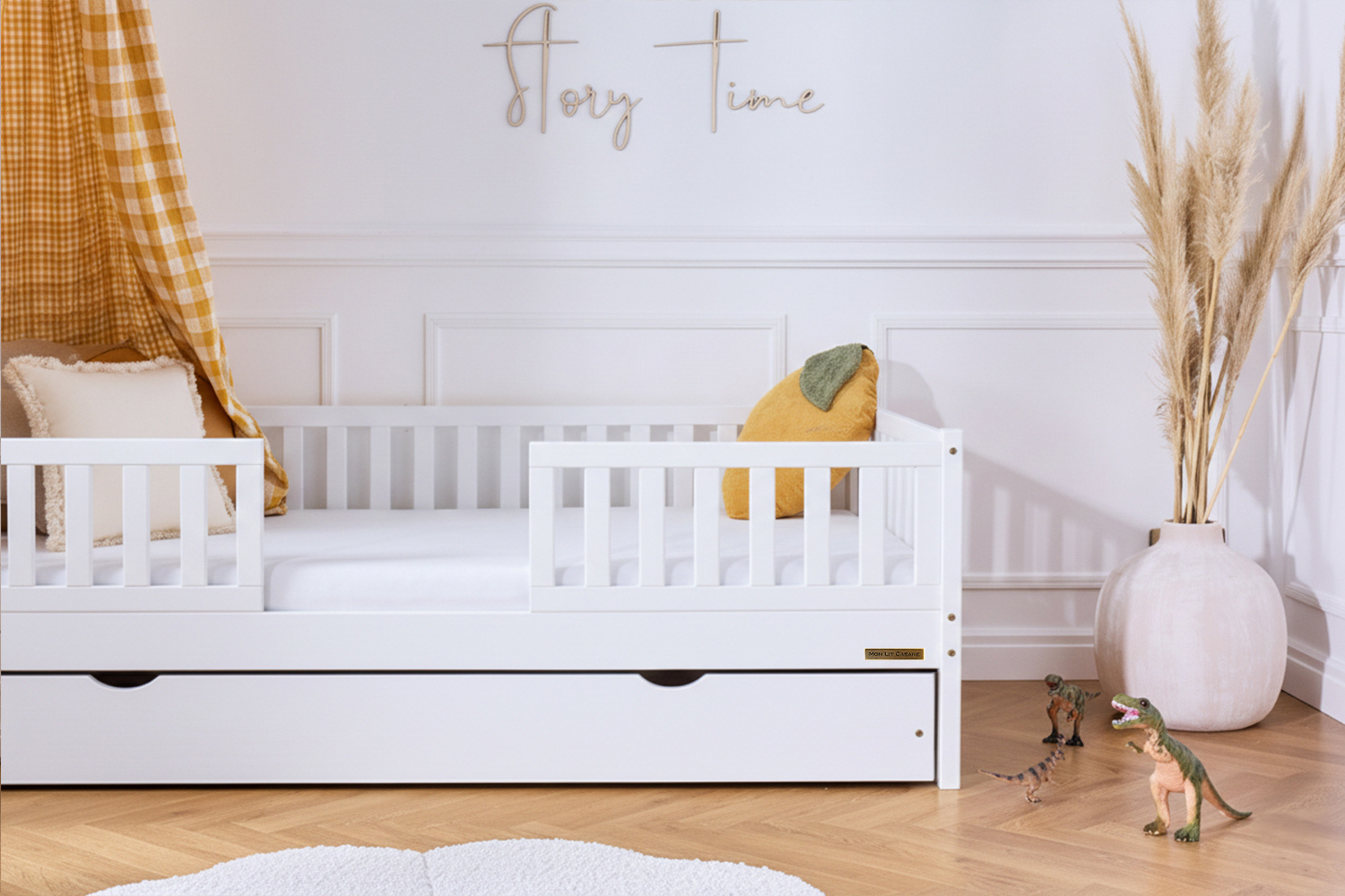 Discover our simple Dakar Bed and its drawer! You can perfectly combine design and practicality thanks to the various options offered (types of barriers, storage drawer or trundle bed). It's up to you to choose!