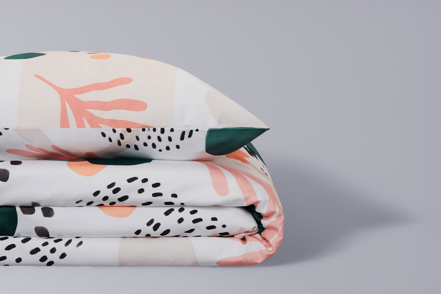 Bedding with a modern pattern inspired by the underwater flora and fauna.