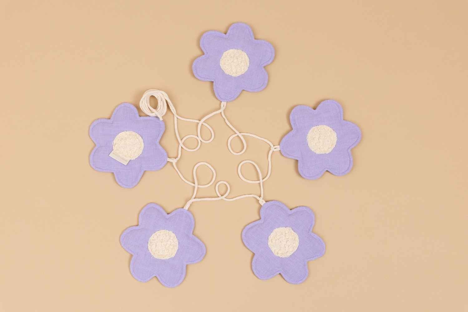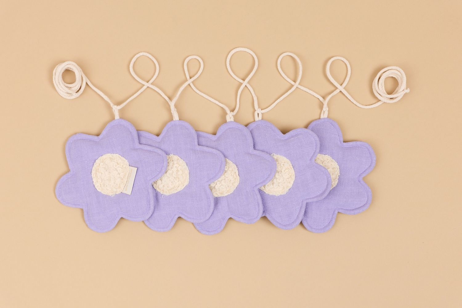 The decoration consists of 5 linen flowers connected by a cotton rope.