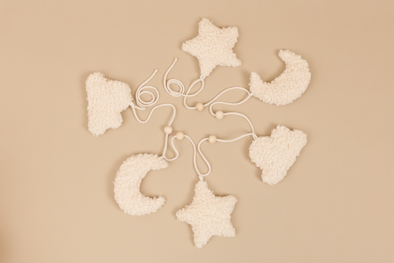 This garland is composed of 2 stars, 2 moons and 2 clouds in delicate colours, all suspended from a cotton thread.