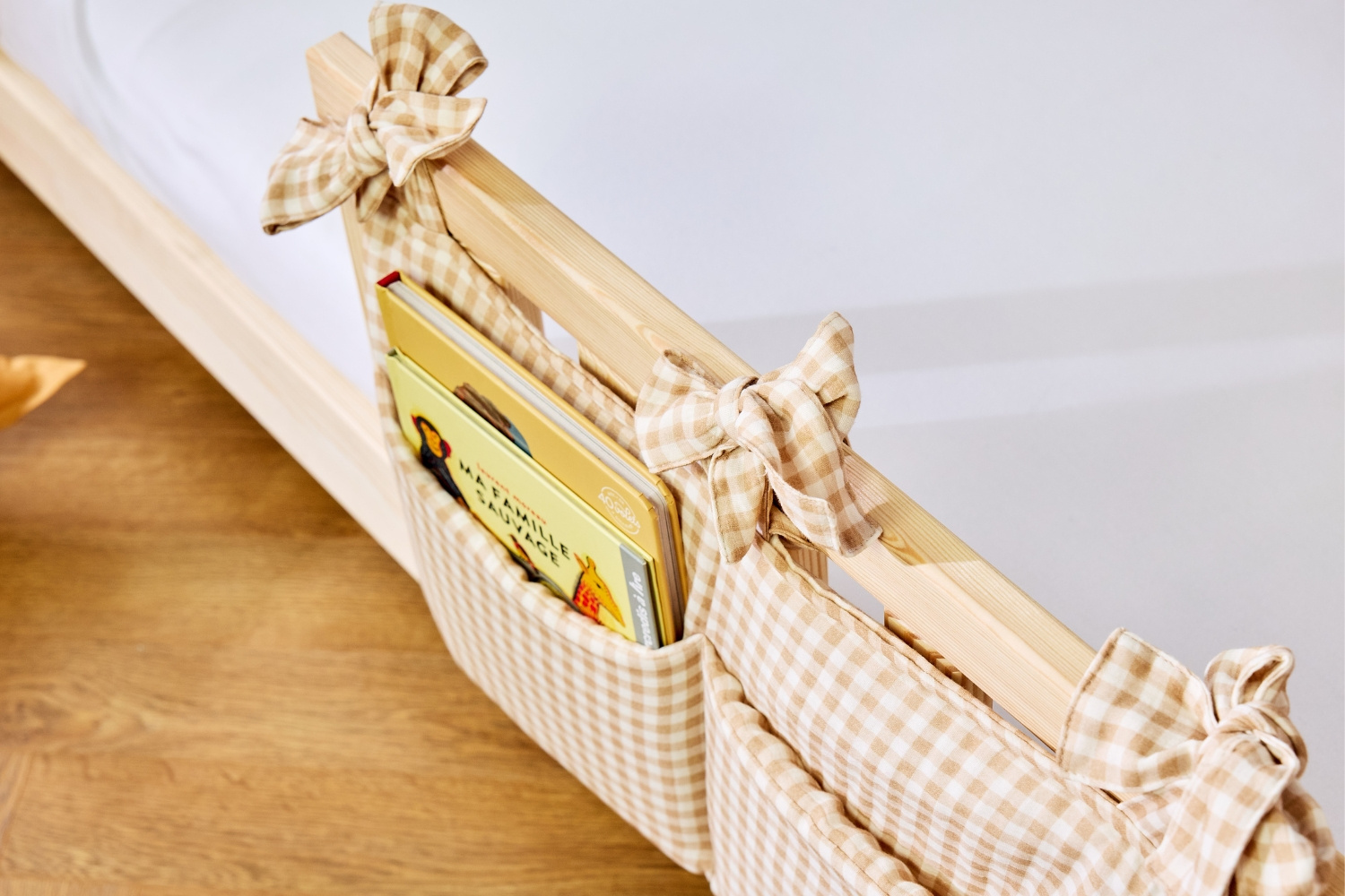 Attached to the barriers of the bed using small ties, it is a beautiful decorative element, its 2 deep pockets make it easy to store pyjamas, baby bottles and books nearby.