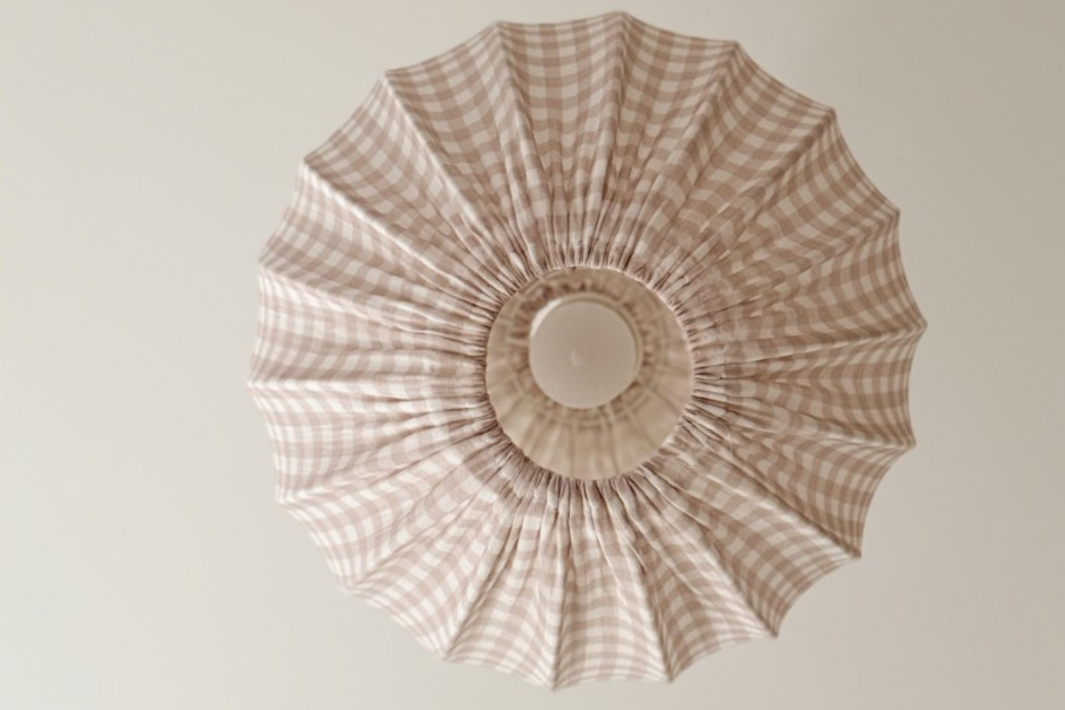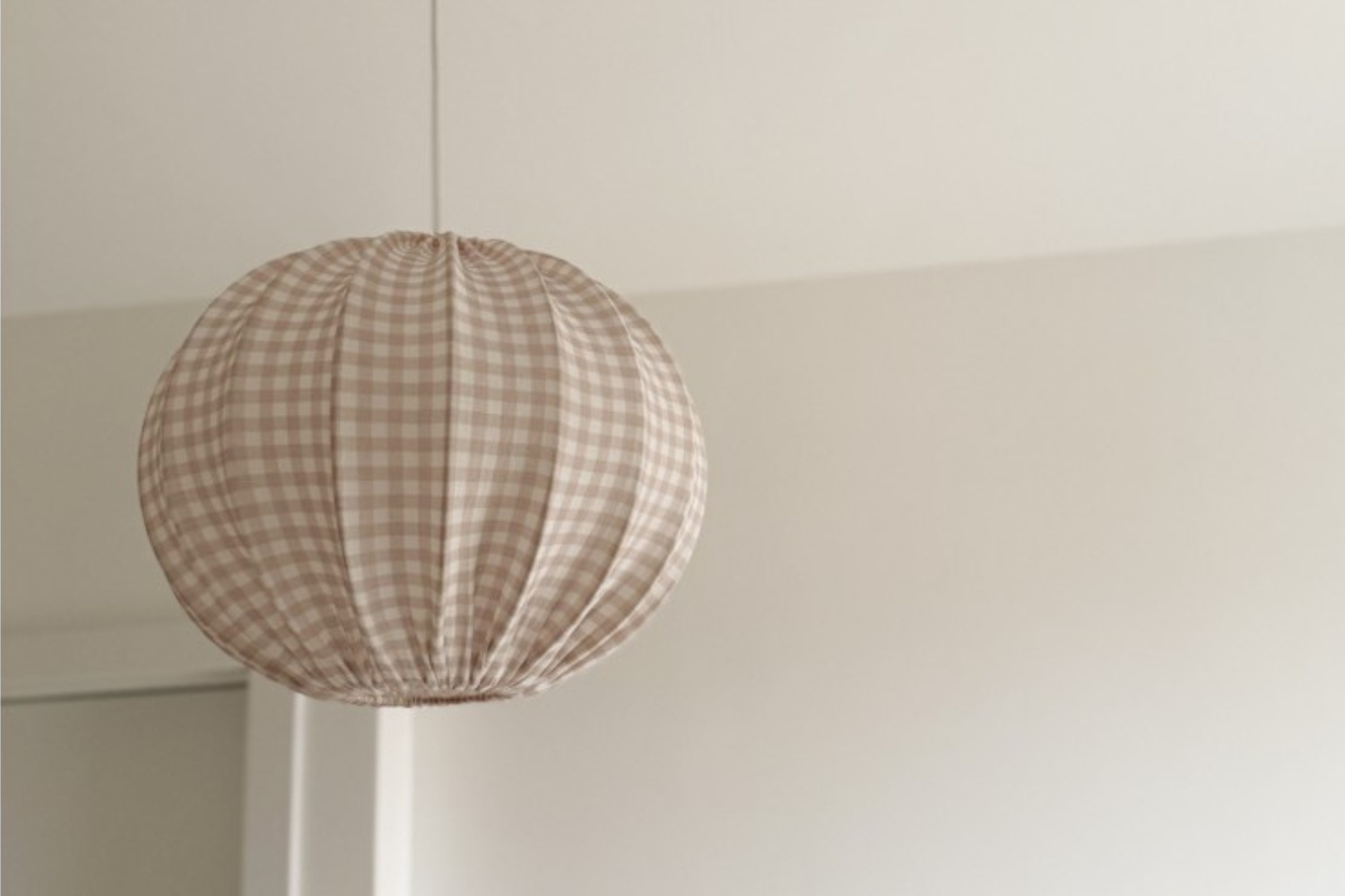 Delicate globe-shaped lampshade made from natural muslin. It brings a soft and warm light to the room and creates a subtle and cosy atmosphere.