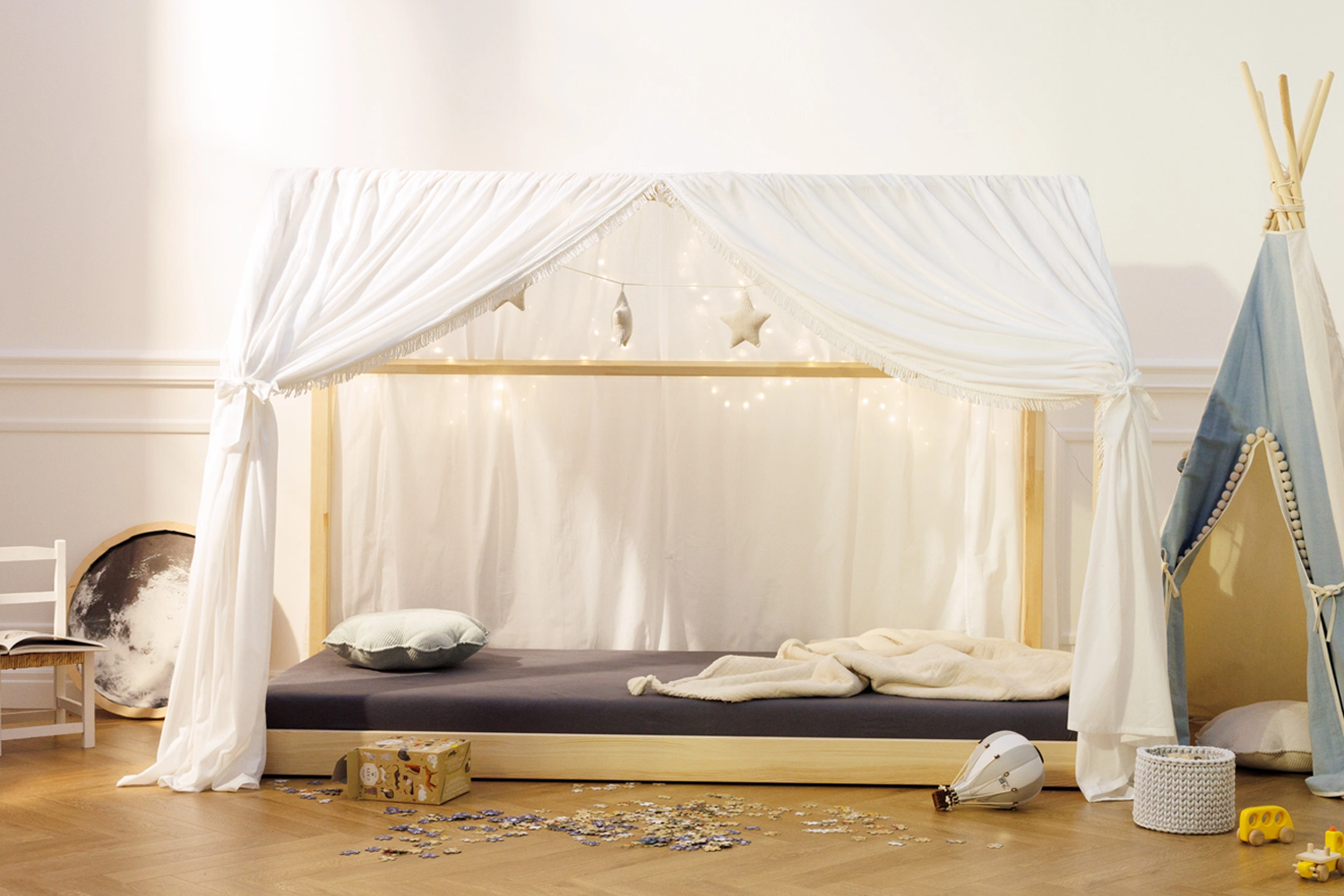 The Boho Twist bed canopy was designed to fulfill the dream of creating a homely minimalist oasis. The canopy is the perfect complement to our wooden House Beds.