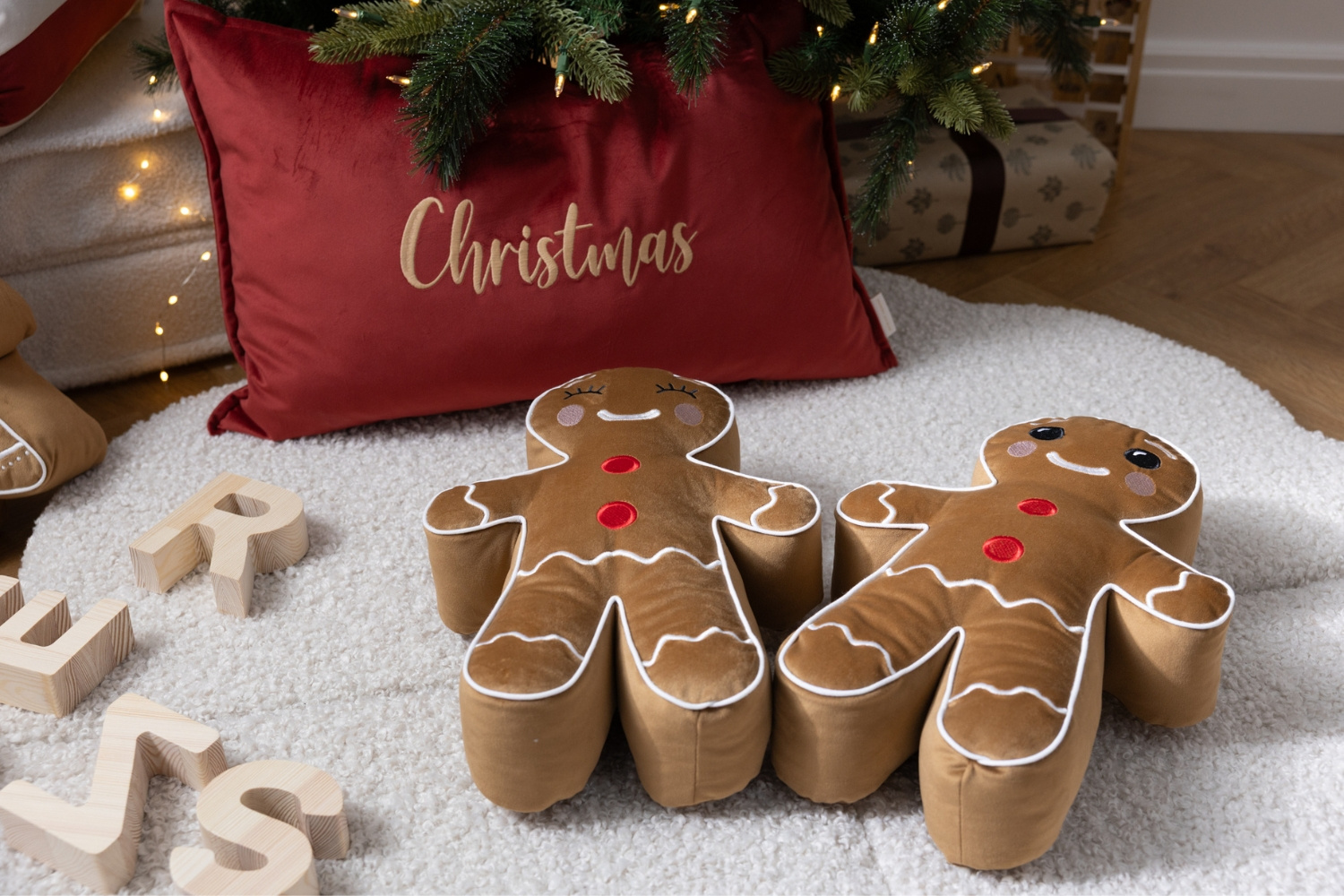 Porta un tocco caldo e festivo nella tua casa con questo cuscino Omino di Pan di Zenzero in velluto caramello.