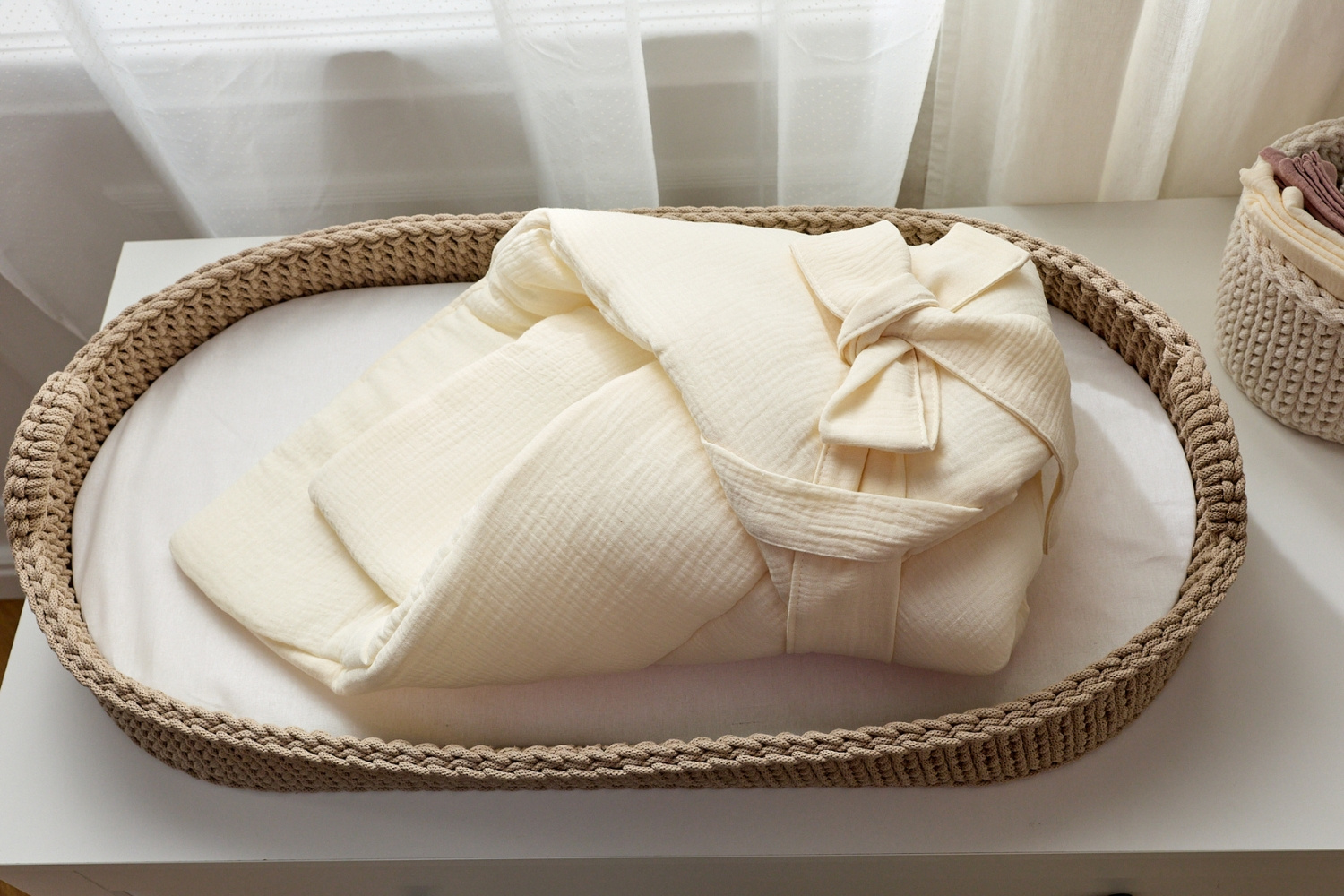 Our baby swaddle wrap combines functionality, aesthetics, and the highest quality certified materials. It helps securely and safely hold a newborn, providing warmth and a comforting sense of closeness.