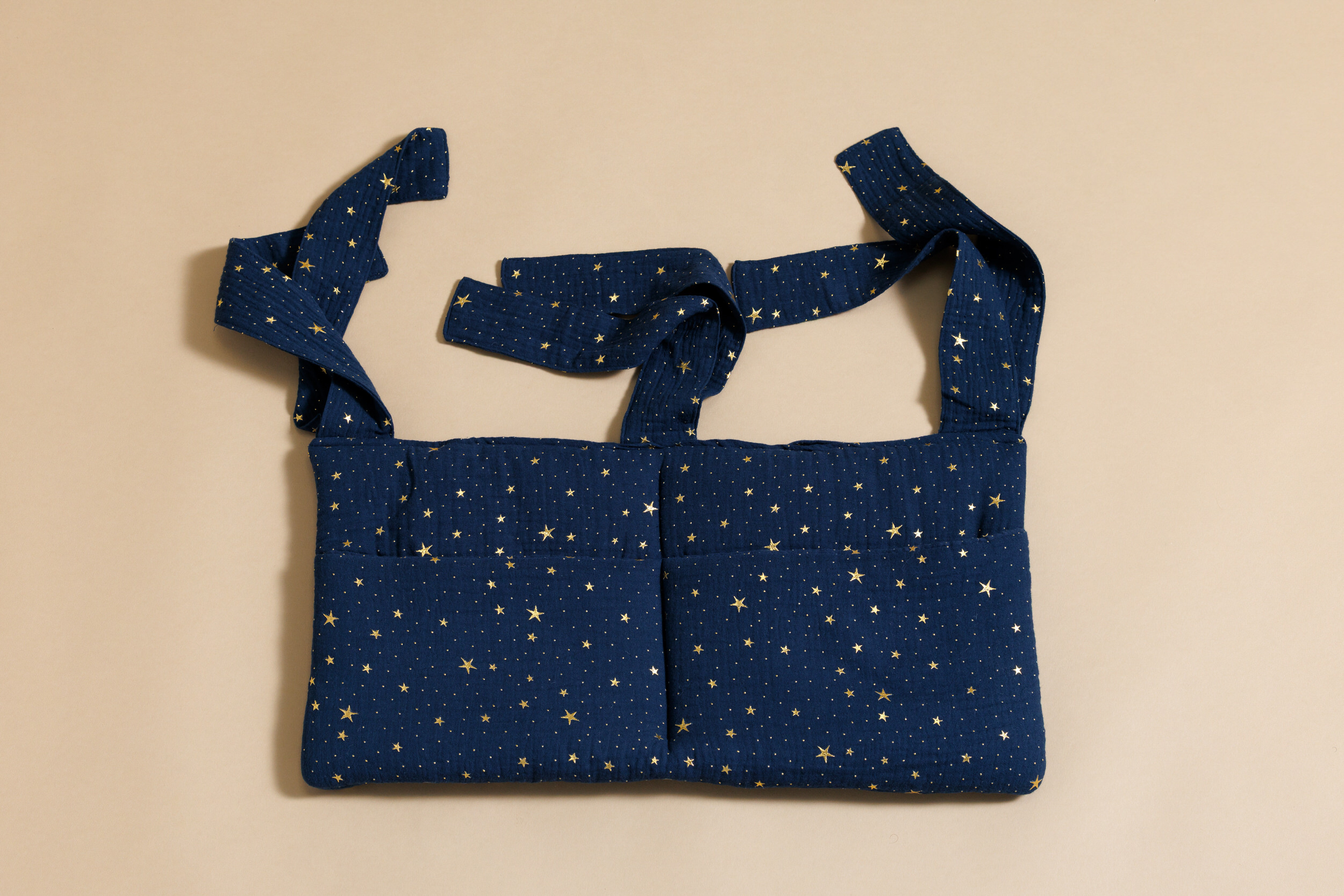 Sujetada a las barreras de la cama mediante pequeños lazos, es un bonito elemento decorativo, sus 2 bolsillos profundos facilitan el almacenamiento de pijamas, biberones y libros cerca.