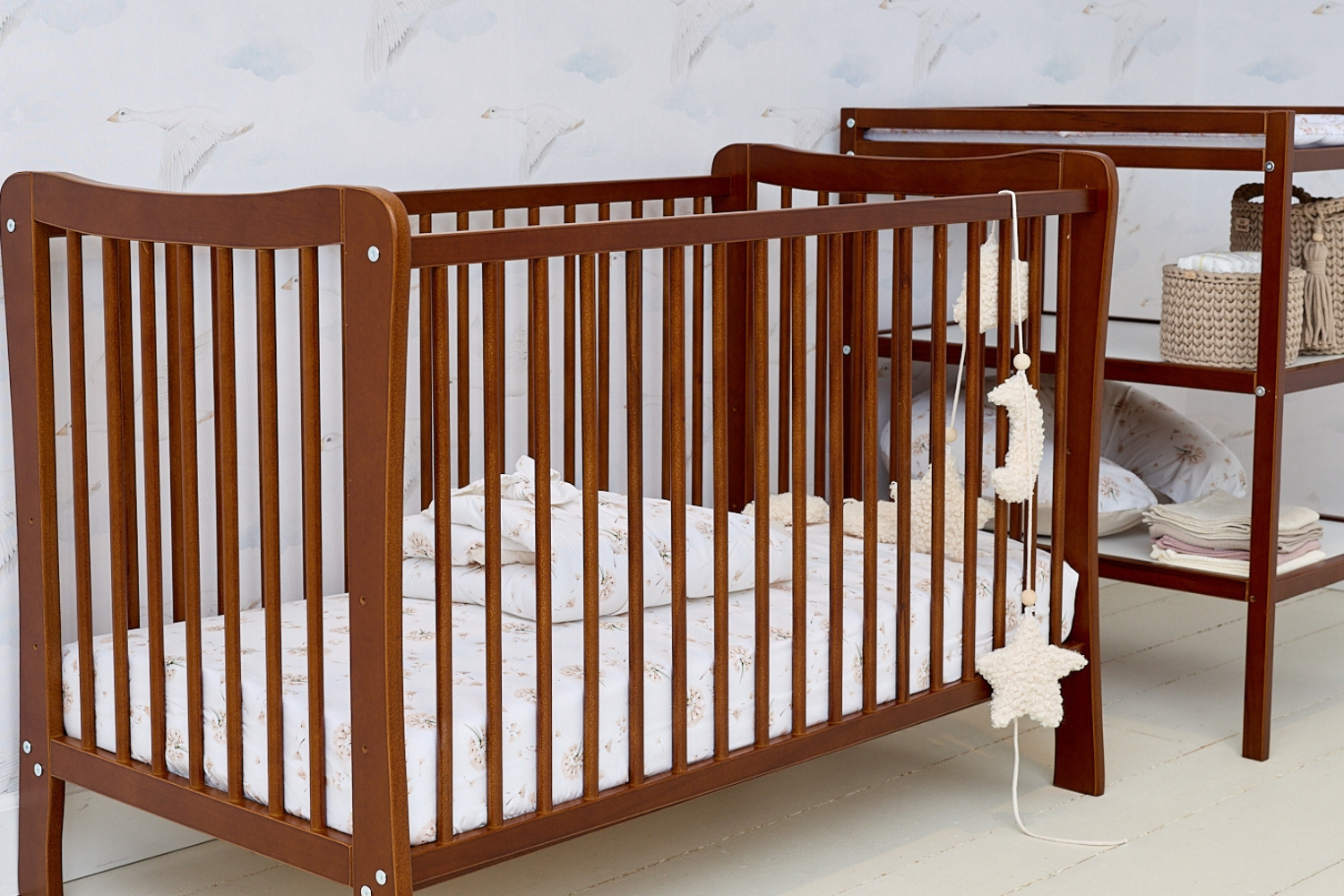 El marco del cambiador está hecho de pino macizo, los estantes son de MDF.