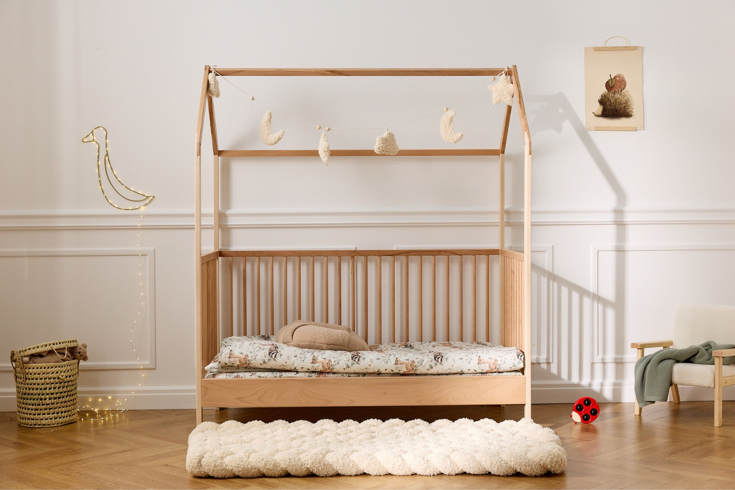 Este modelo de cama casita para bebé está fabricado en madera de haya ecológica de alta calidad. Diseñada con cuidado y protegida con un barniz ecológico certificado, la madera de haya garantiza mayor solidez y durabilidad. El fondo con lamas aporta estabilidad y mejor ventilación para el colchón.