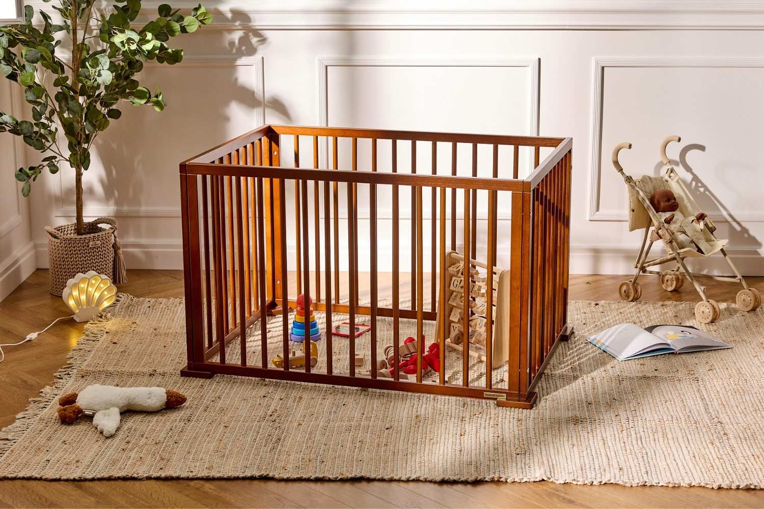 Este parque para bebé está fabricado en madera de haya ecológica de alta calidad. Diseñado con cuidado y protegido con un barniz ecológico certificado, la madera de haya garantiza mayor solidez y durabilidad.