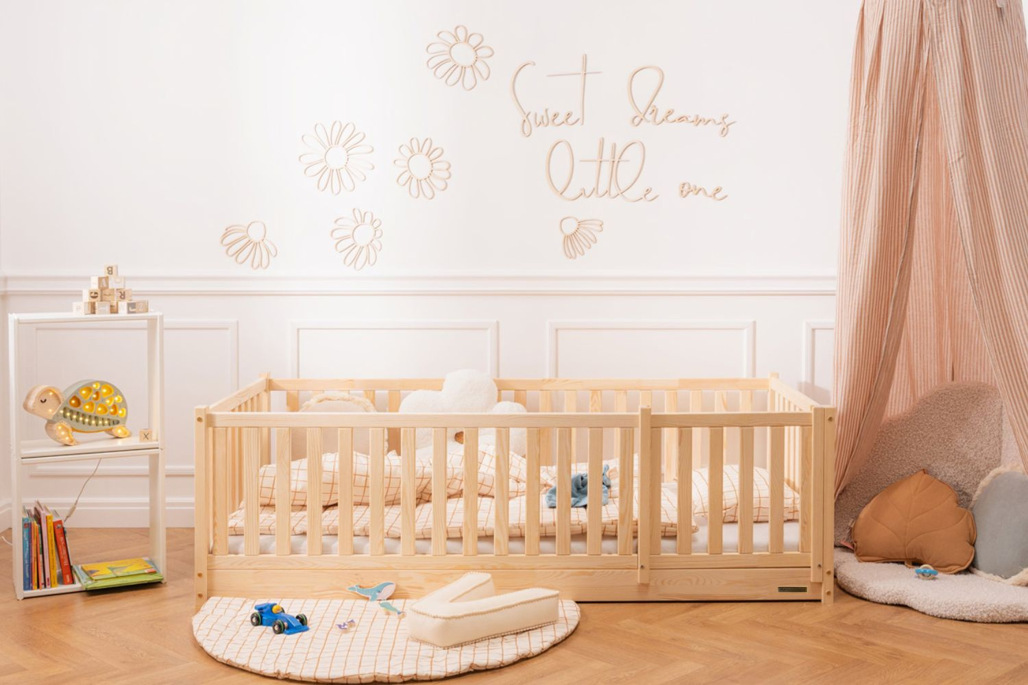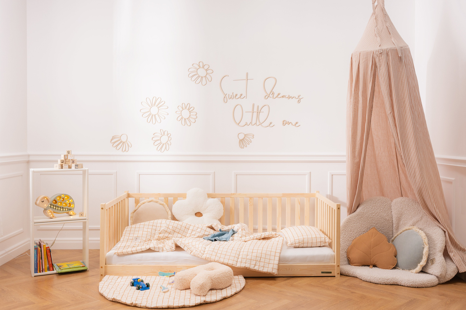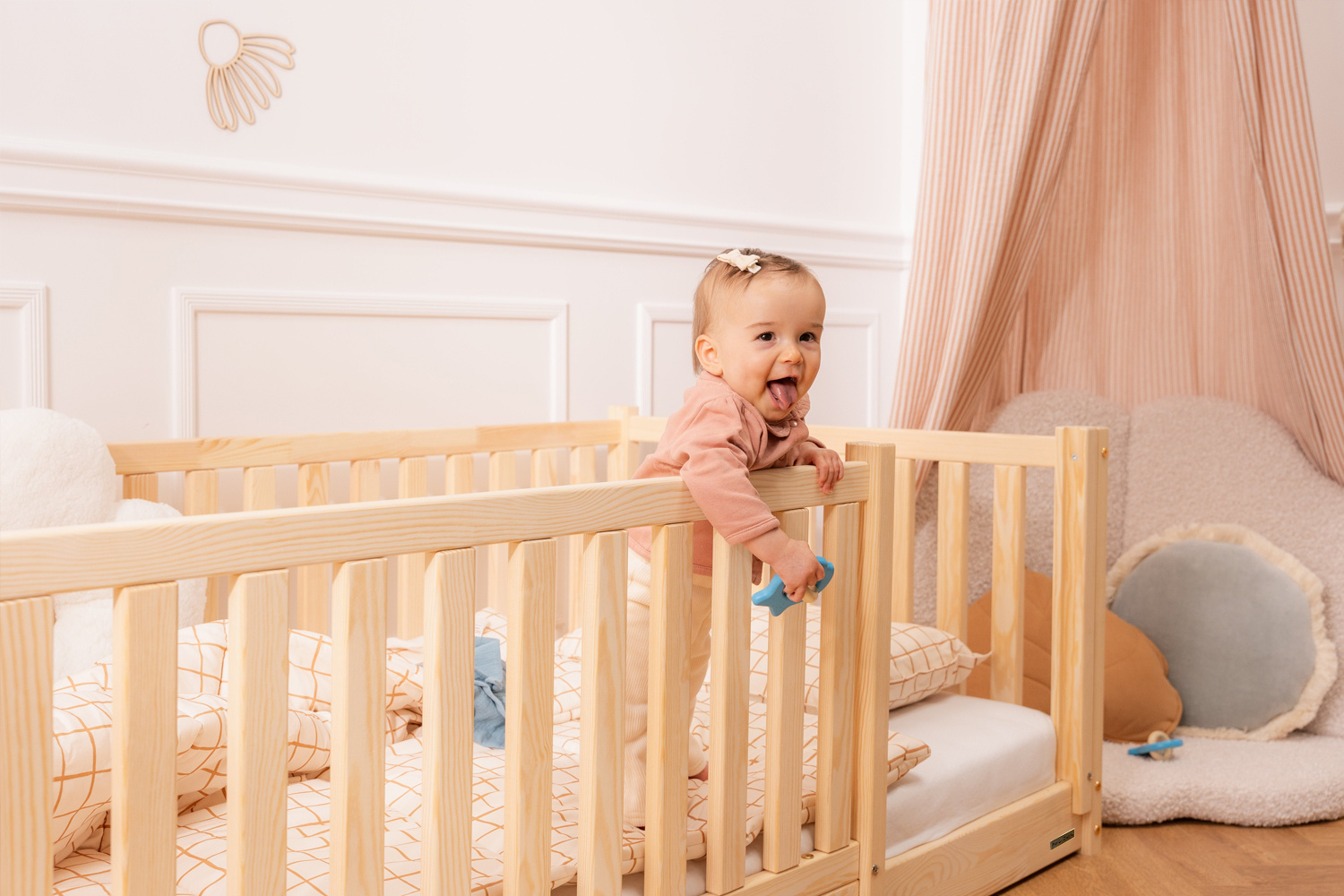 La cama Tokyo se inspira en el método Montessori, con un colchón colocado a pocos centímetros del suelo. Esto permite incluso a los más pequeños, que comienzan a gatear, subir y bajar de la cama fácilmente y de forma segura, ya sea para dormir o jugar. Este enfoque fomenta la autonomía y la exploración de manera natural.
