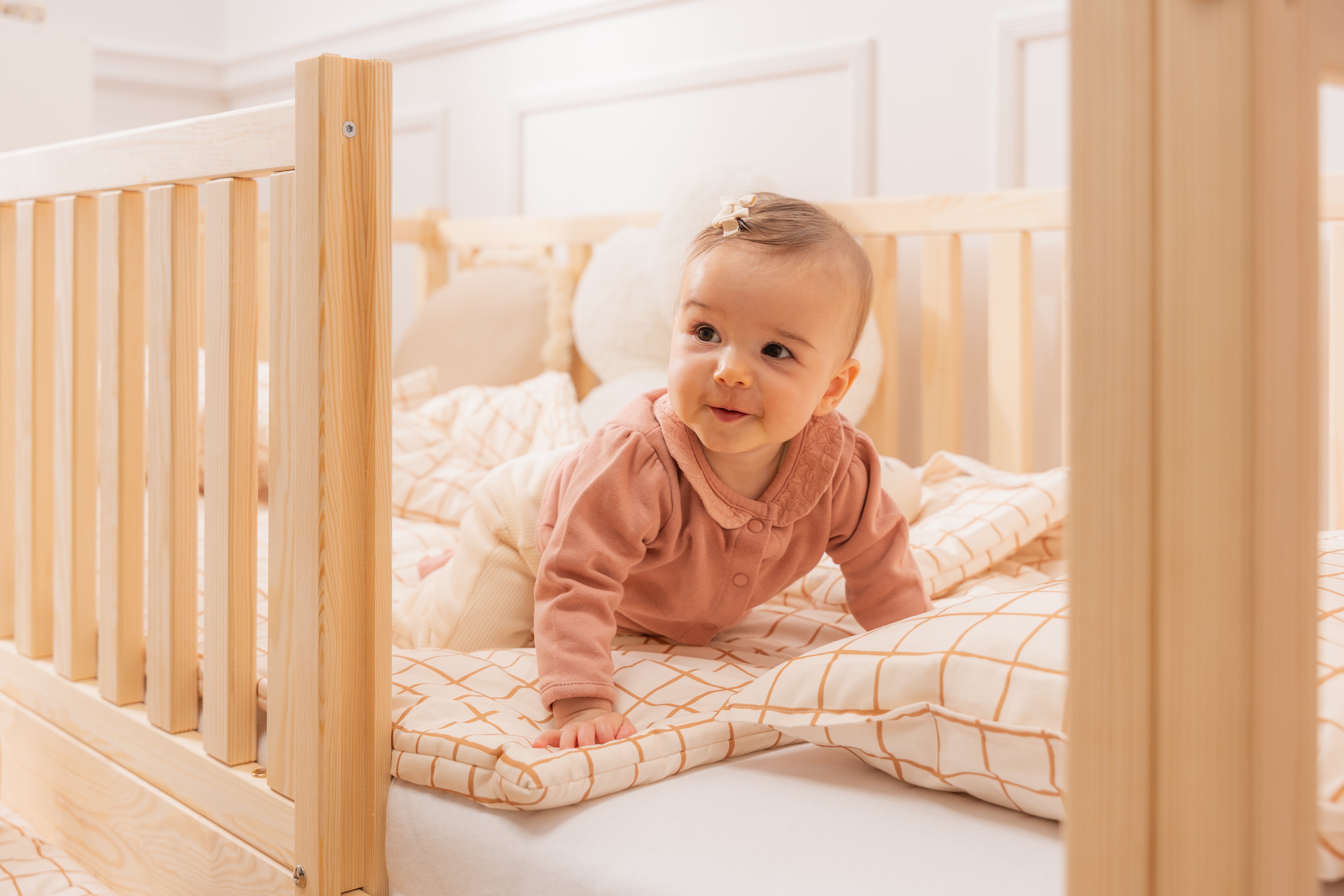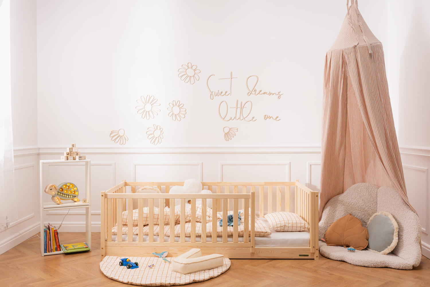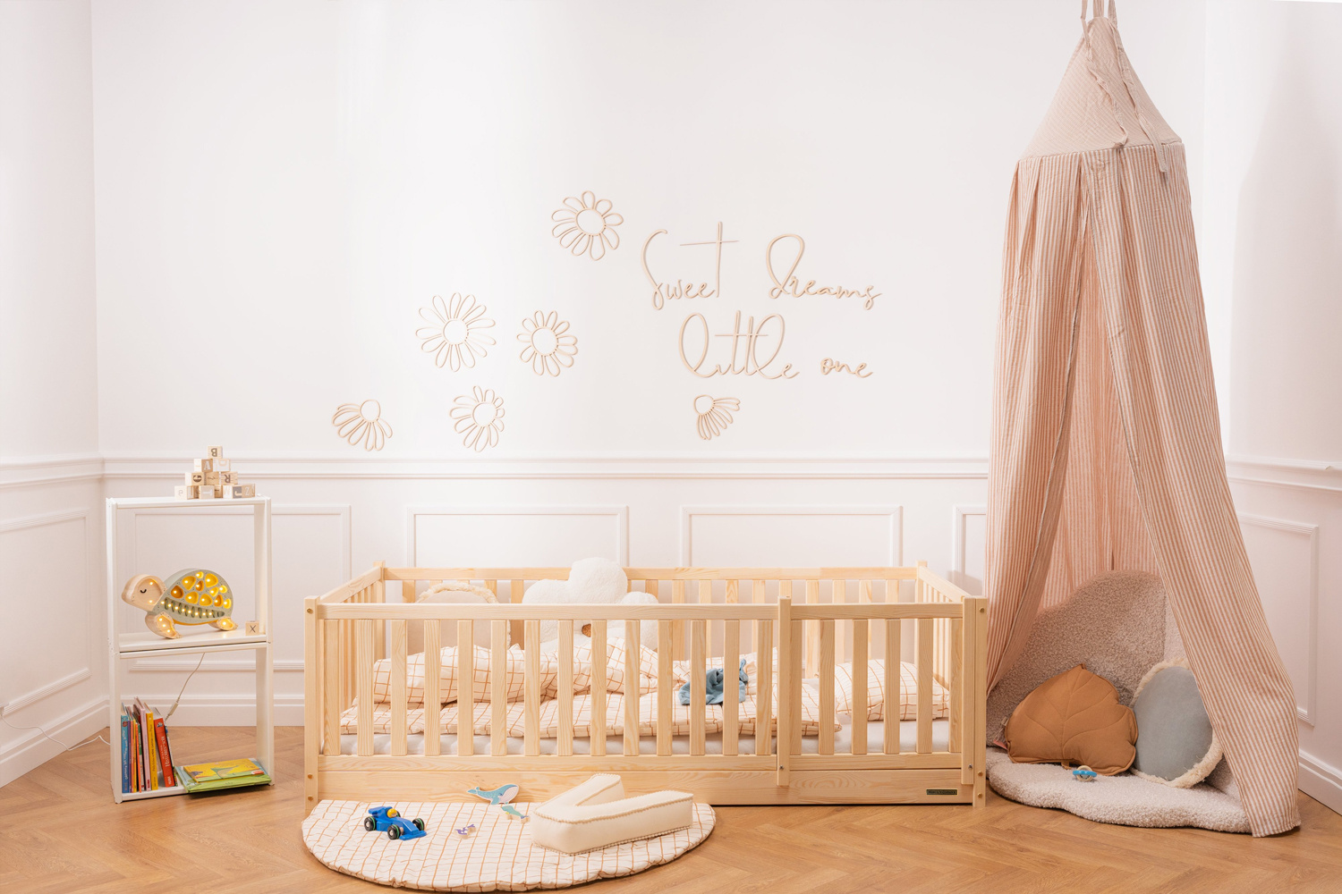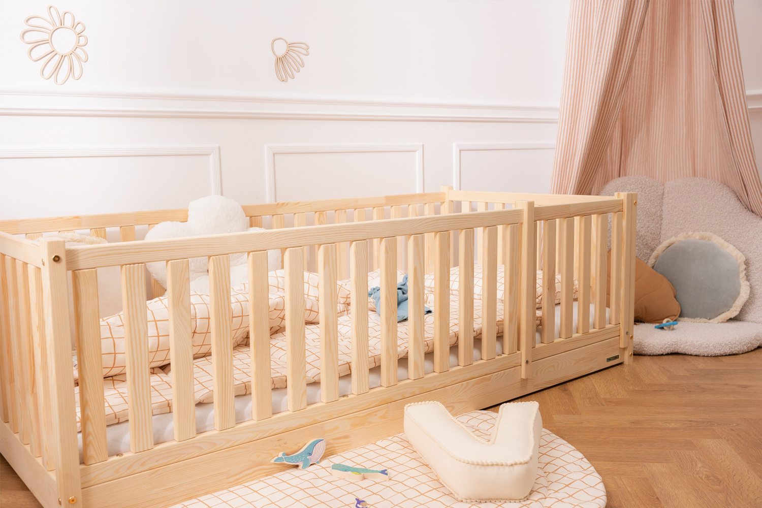 La cama Tokyo se inspira en el método Montessori, con un colchón colocado a pocos centímetros del suelo. Esto permite incluso a los más pequeños, que comienzan a gatear, subir y bajar de la cama fácilmente y de forma segura, ya sea para dormir o jugar. Este enfoque fomenta la autonomía y la exploración de manera natural.
