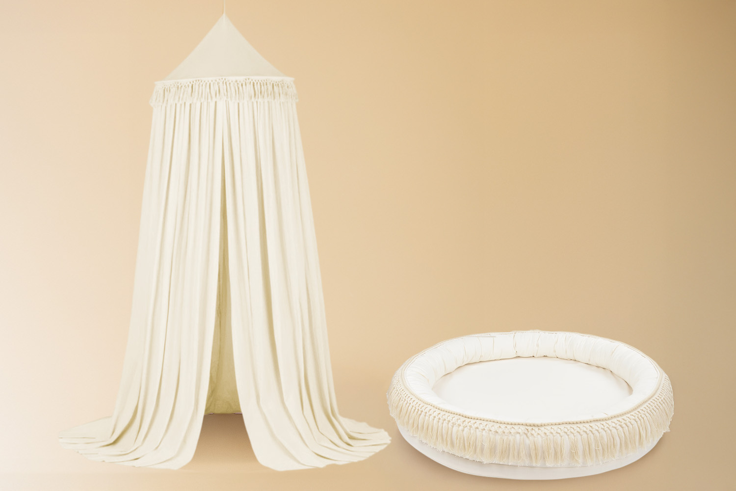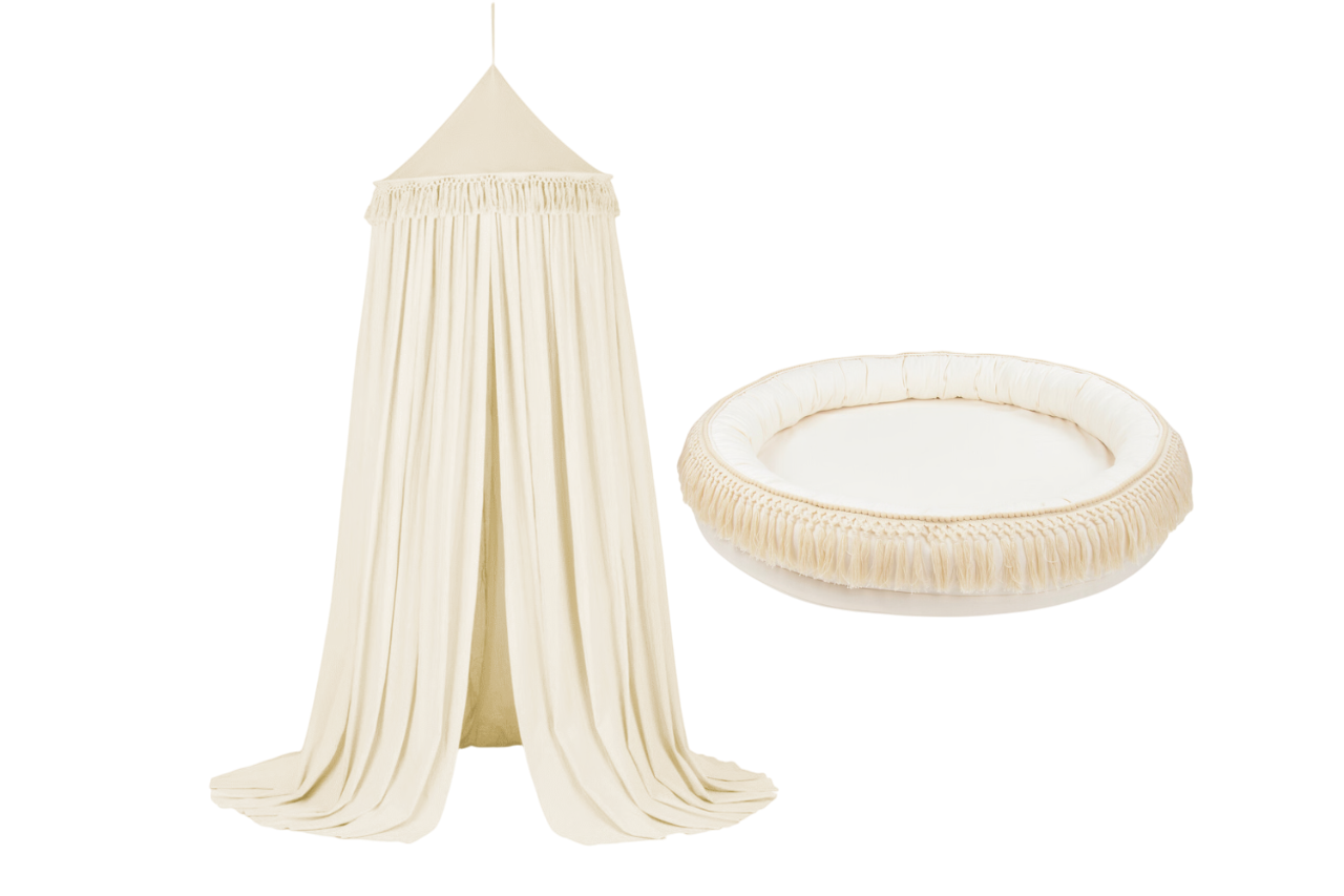 Nuestro cojunto de cielo de cama y puff de la colección Boho Vanilla es una preciosidad.