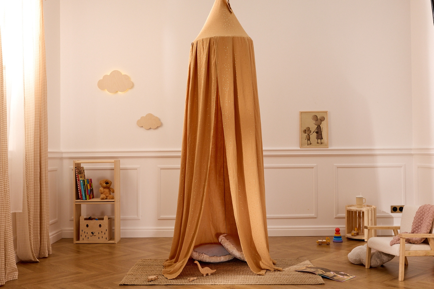 Puede colgarse de un gancho de techo (no incluido) o de un soporte especial. Crea un espacio tranquilo y cerrado sobre la cama del niño, proporcionándole un lugar seguro para descansar.