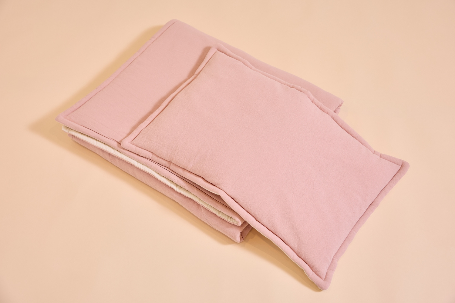 El conjunto consta de una almohada con relleno, con un borde decorativo, y un edredón ligero con relleno de silicona hipoalergénico.