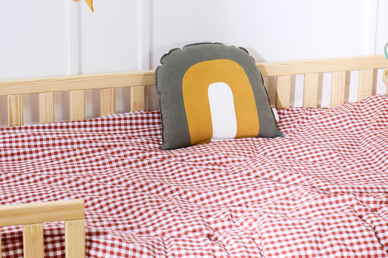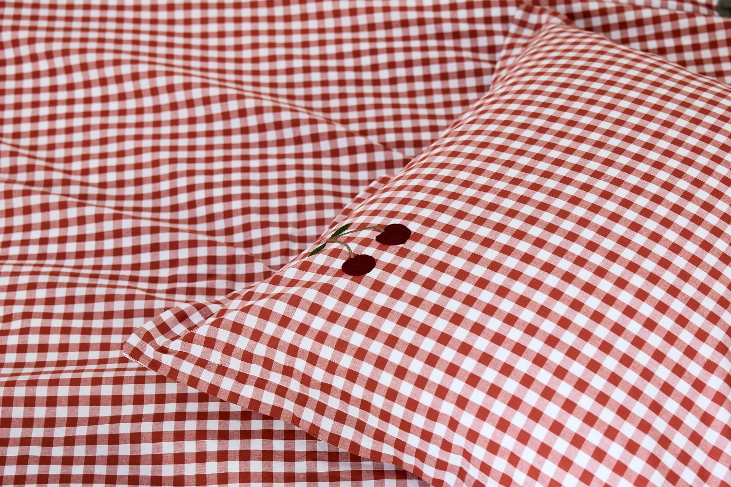 Nuestro encantador juego de ropa de cama de cuadros en algodón para niños, con un delicado bordado de cerezas, está hecho de algodón de la más alta calidad.