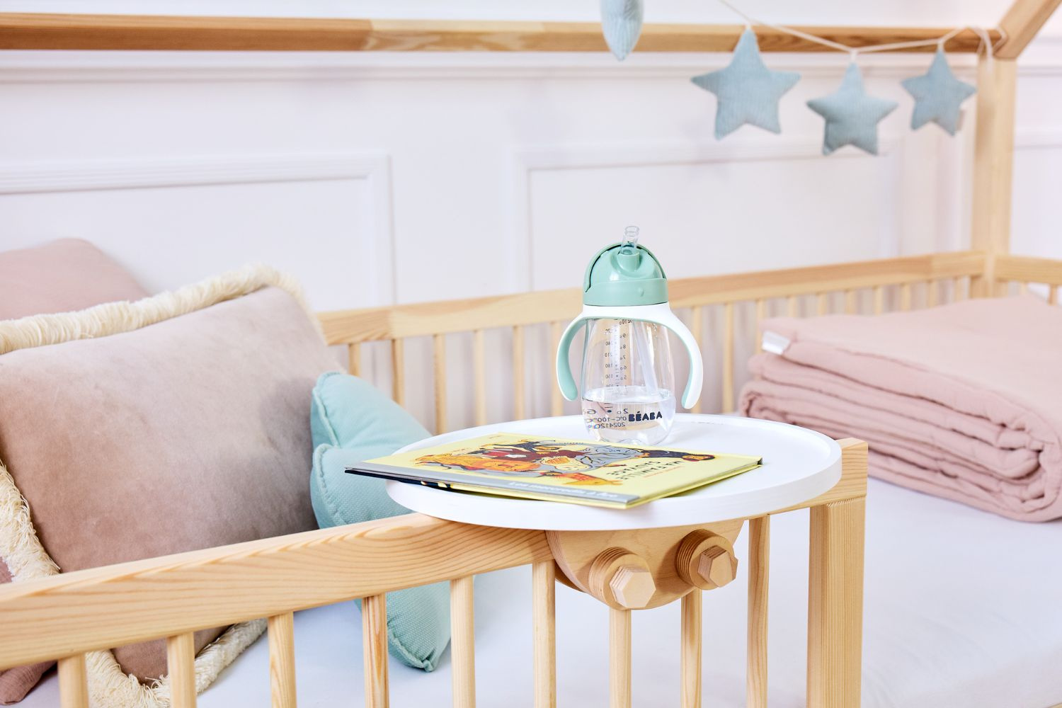 Diseñada con gracia para fijarse fácilmente a las barreras de la cama, esta mesilla es el complemento perfecto para guardar los libros favoritos de tus hijos antes de dormir, o sus peluches, manteniendo al mismo tiempo la estética aerodinámica de su dormitorio.