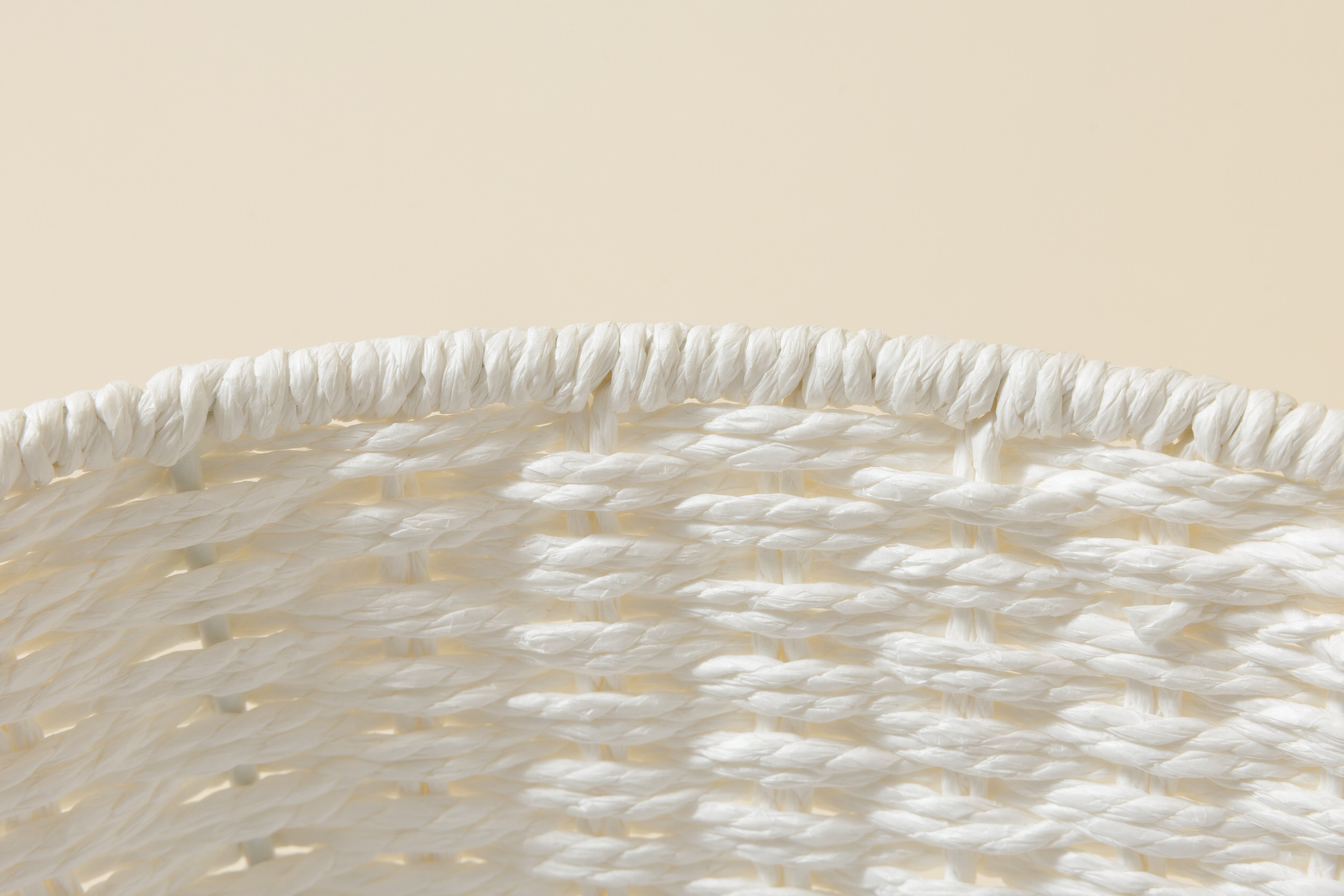 ⊕ El moisés está tejido a mano con cuerda de papel sobre un marco metálico