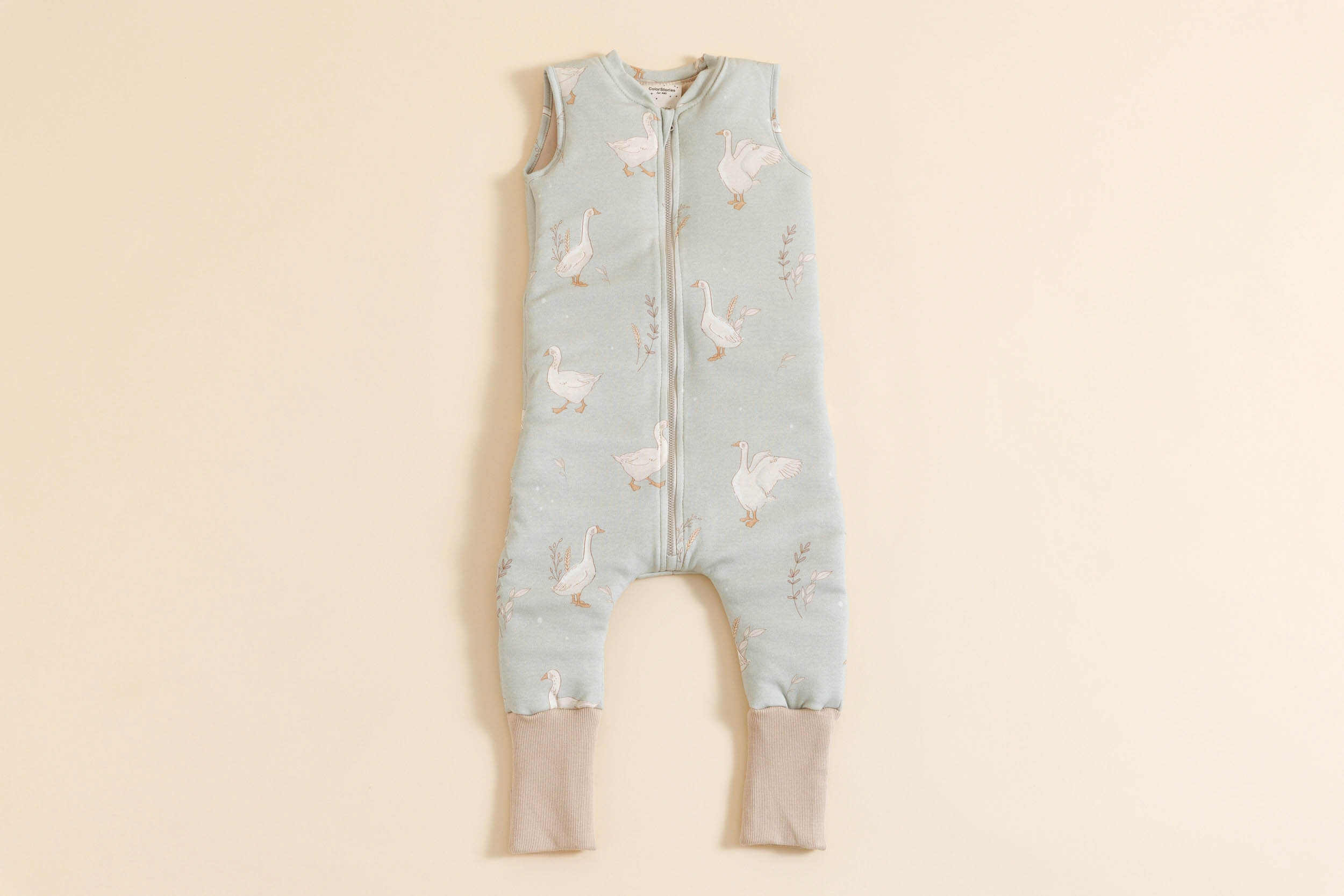El saco de dormir tiene largas piernas de suave canalé de algodón, a las que también se pueden doblar los puños para cubrir los pies.
