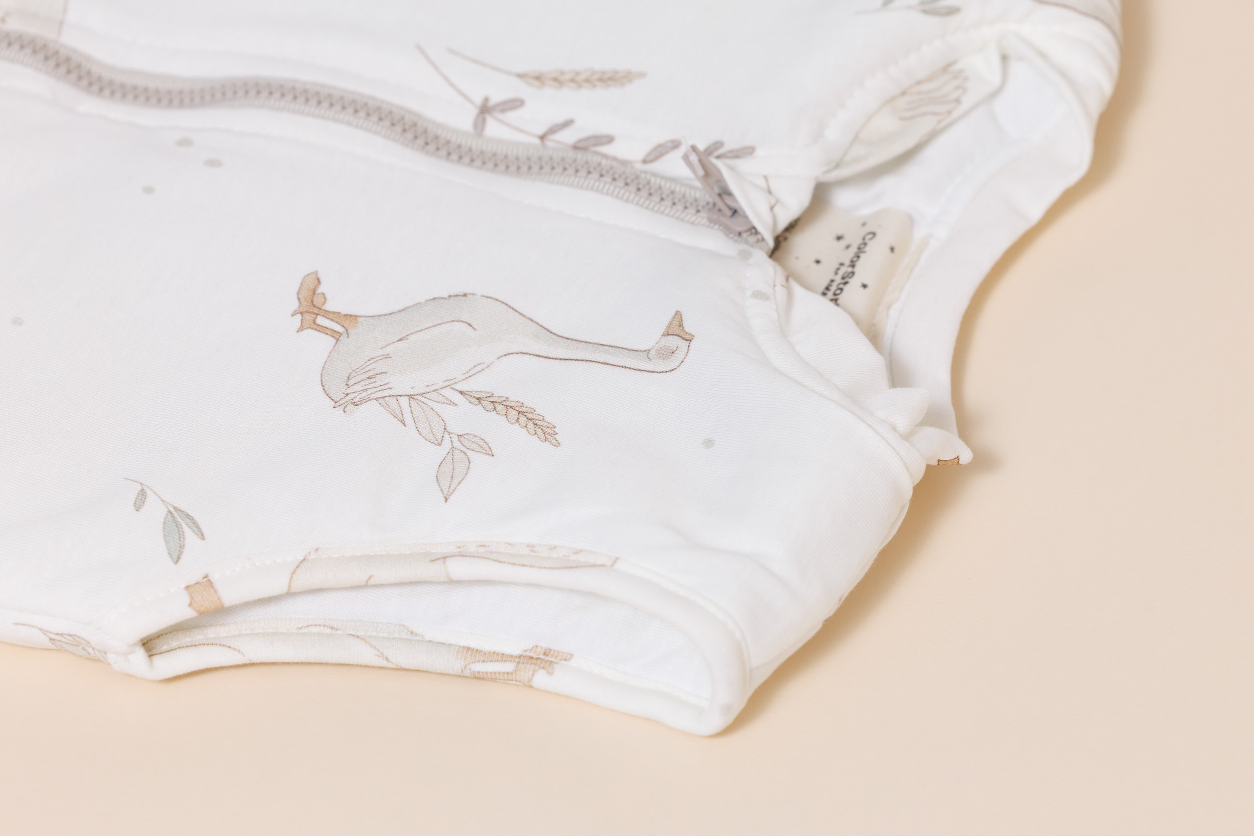 El saco de dormir tiene largas piernas de suave canalé de algodón, a las que también se pueden doblar los puños para cubrir los pies.