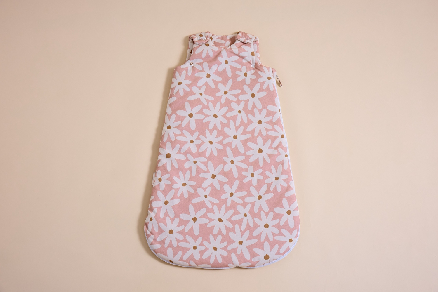 Un saco de dormir práctico hecho de algodón estampado, forrado con relleno de fibra de silicona hipoalergénica.