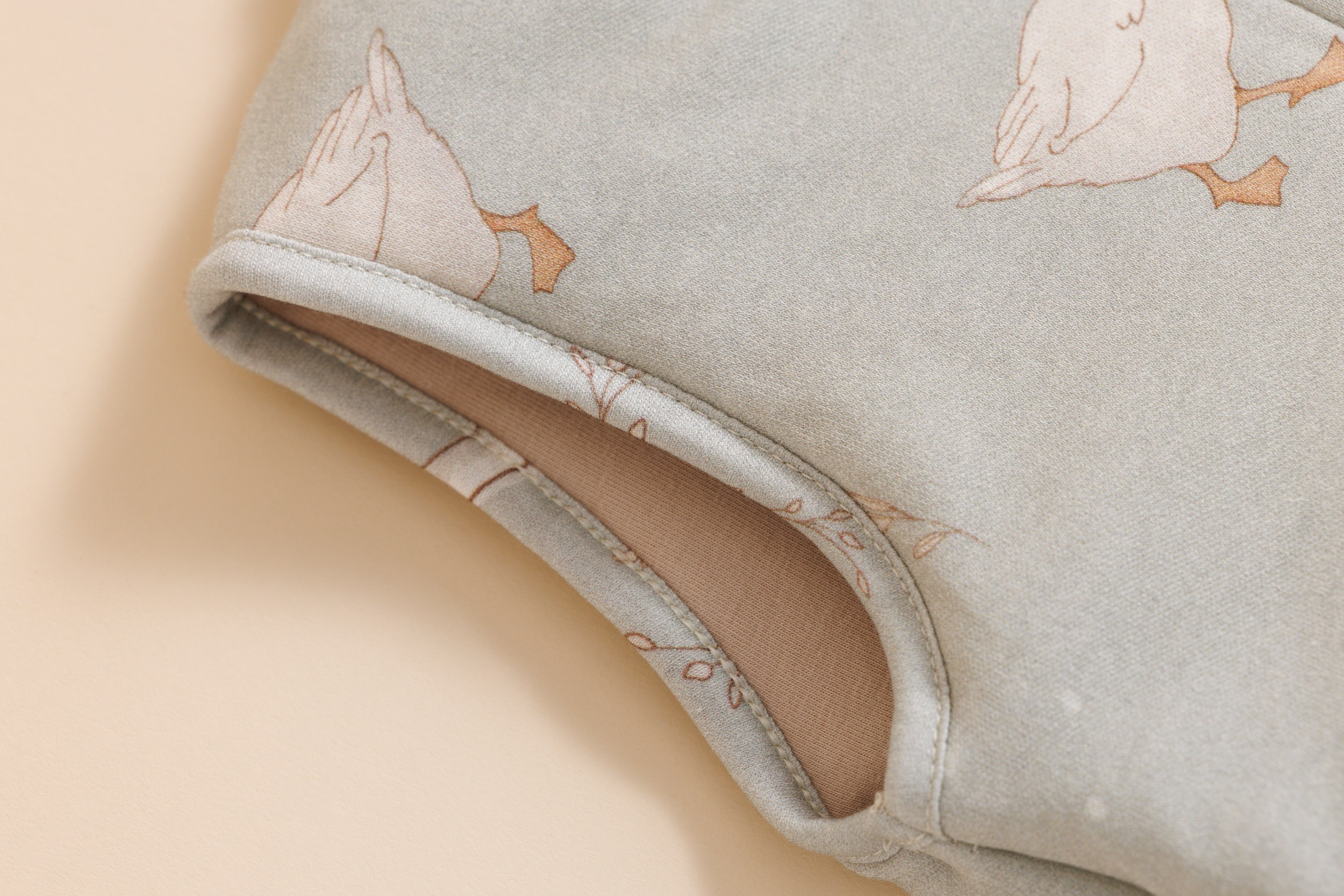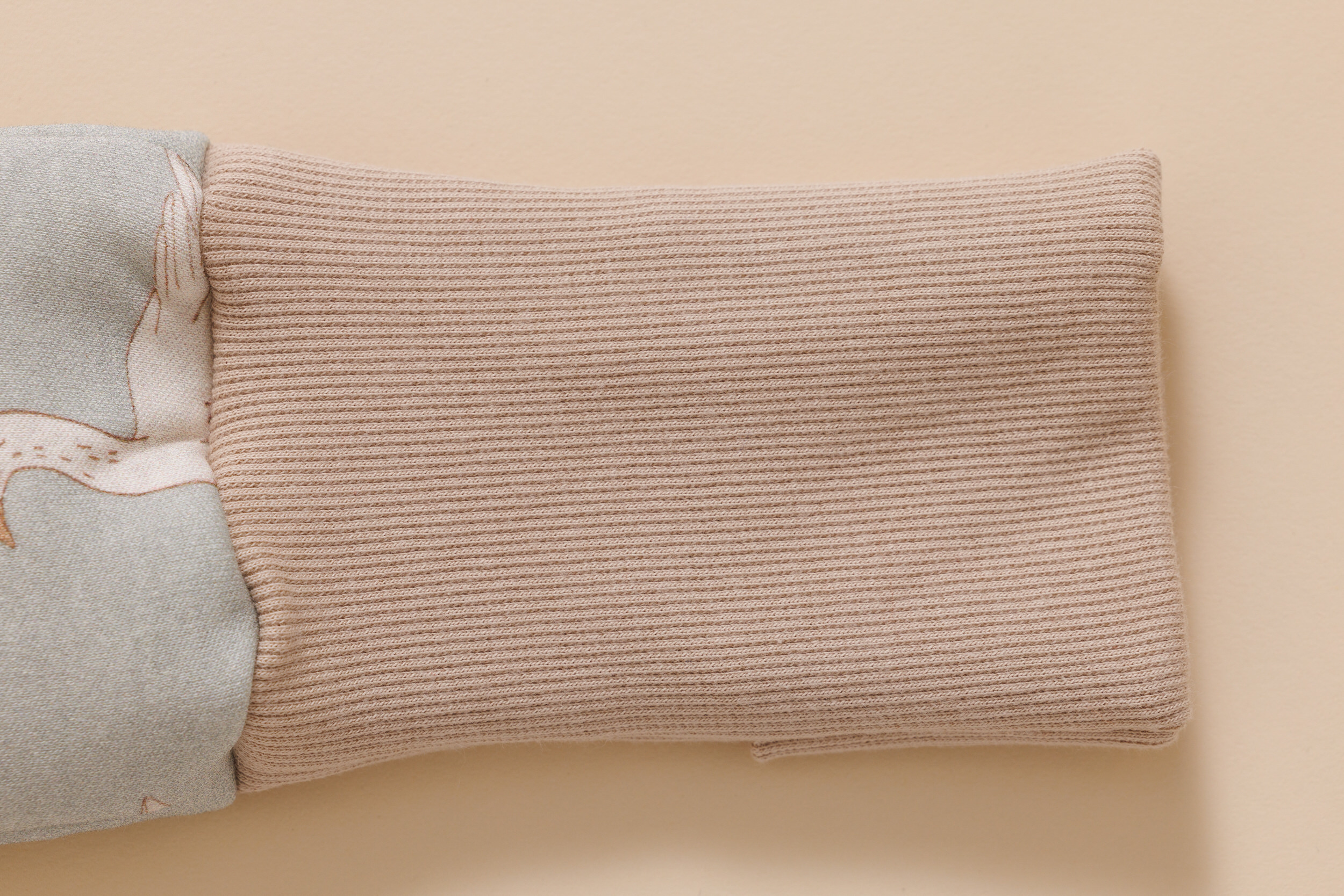 El saco de dormir tiene largas piernas de suave canalé de algodón, a las que también se pueden doblar los puños para cubrir los pies.