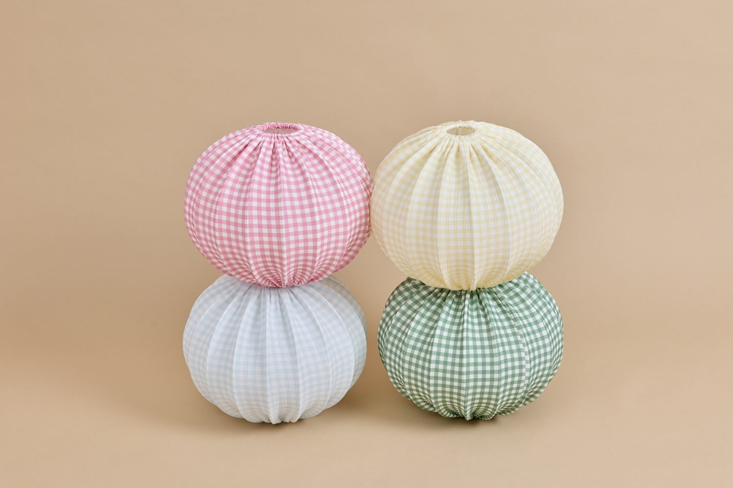 Abat-jour délicat en forme de boule, réalisé en mousseline naturelle.