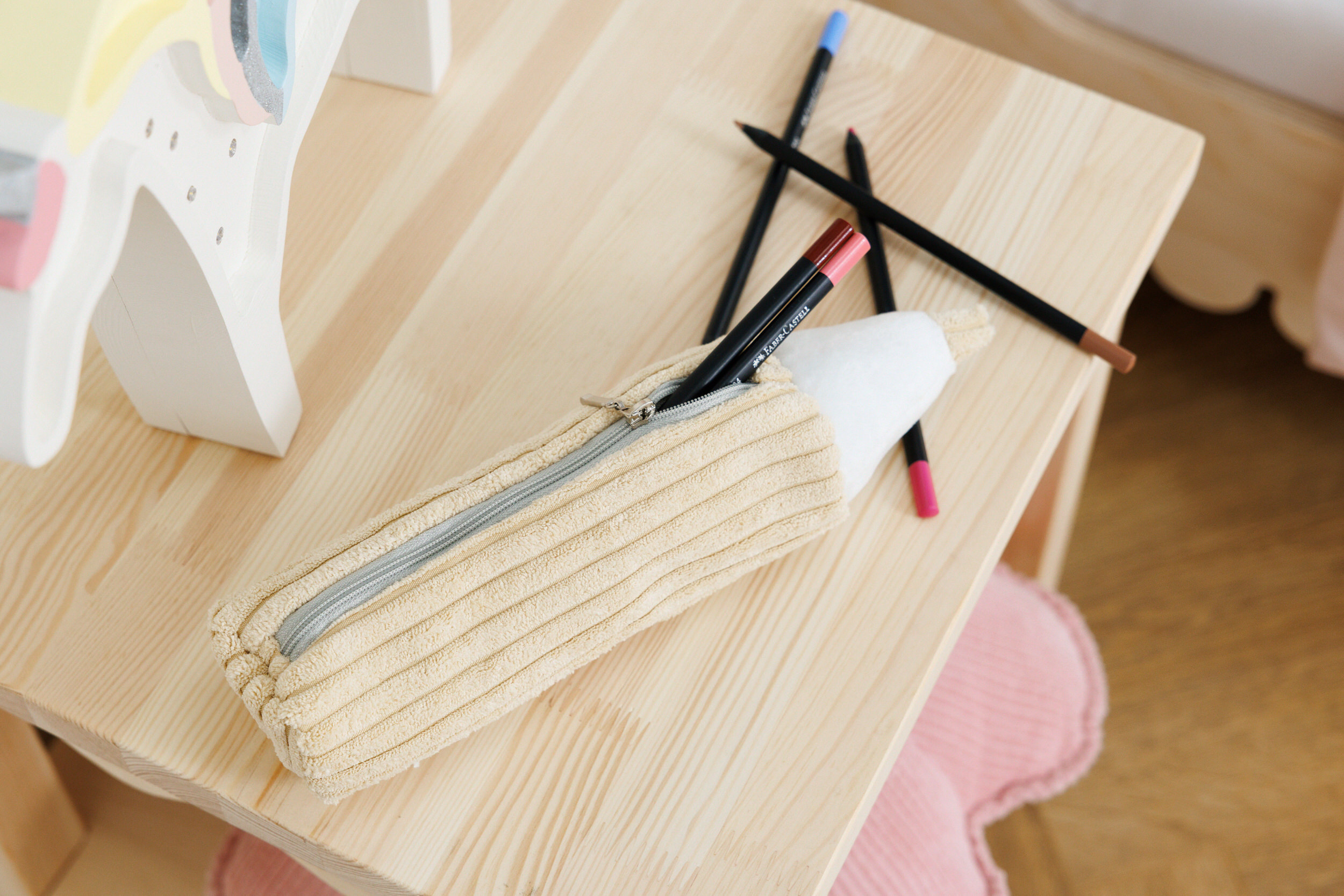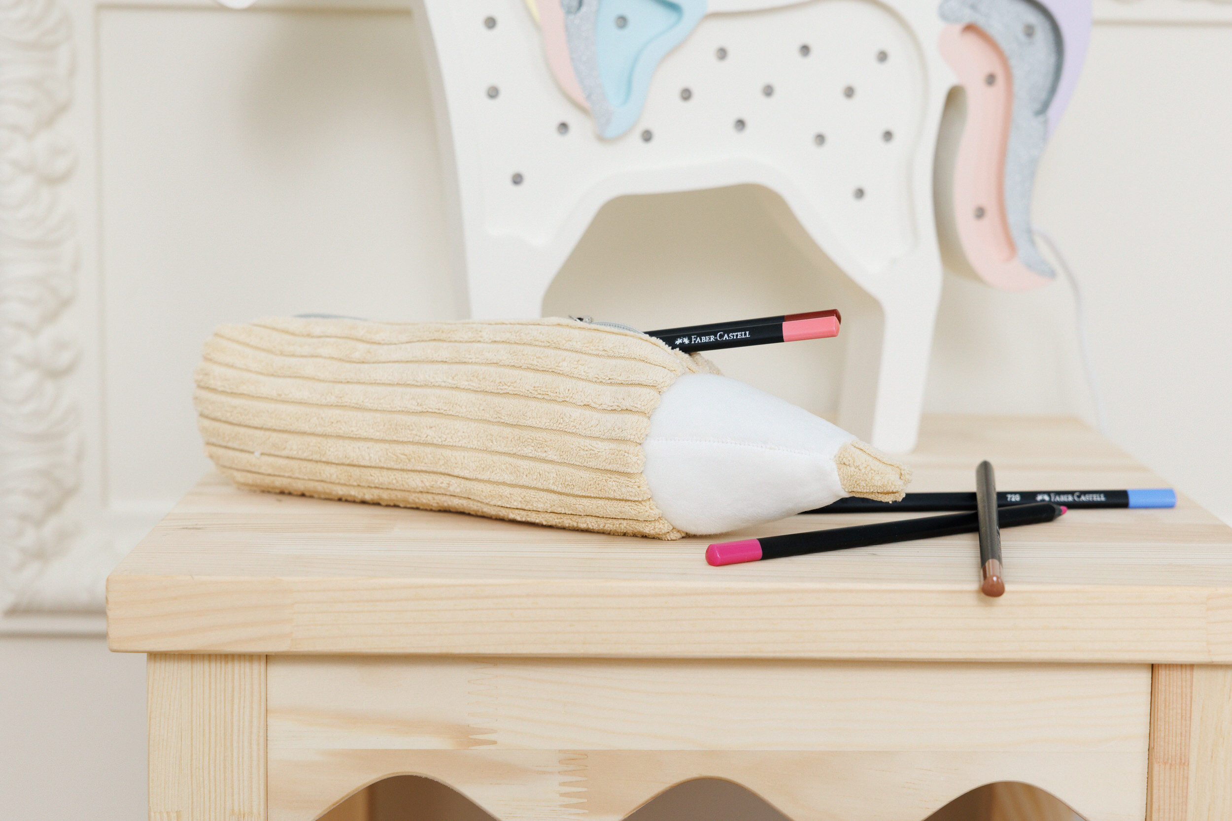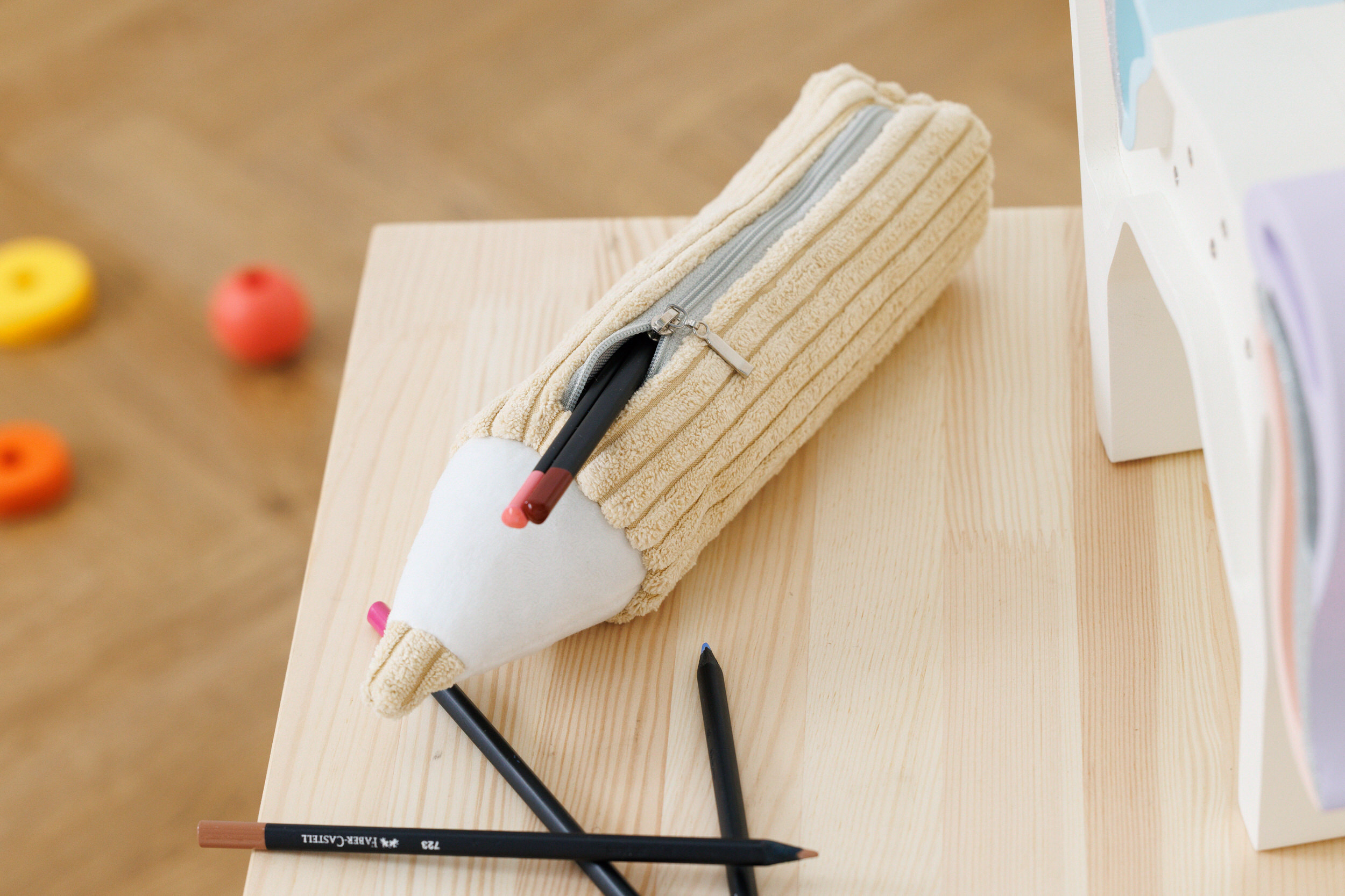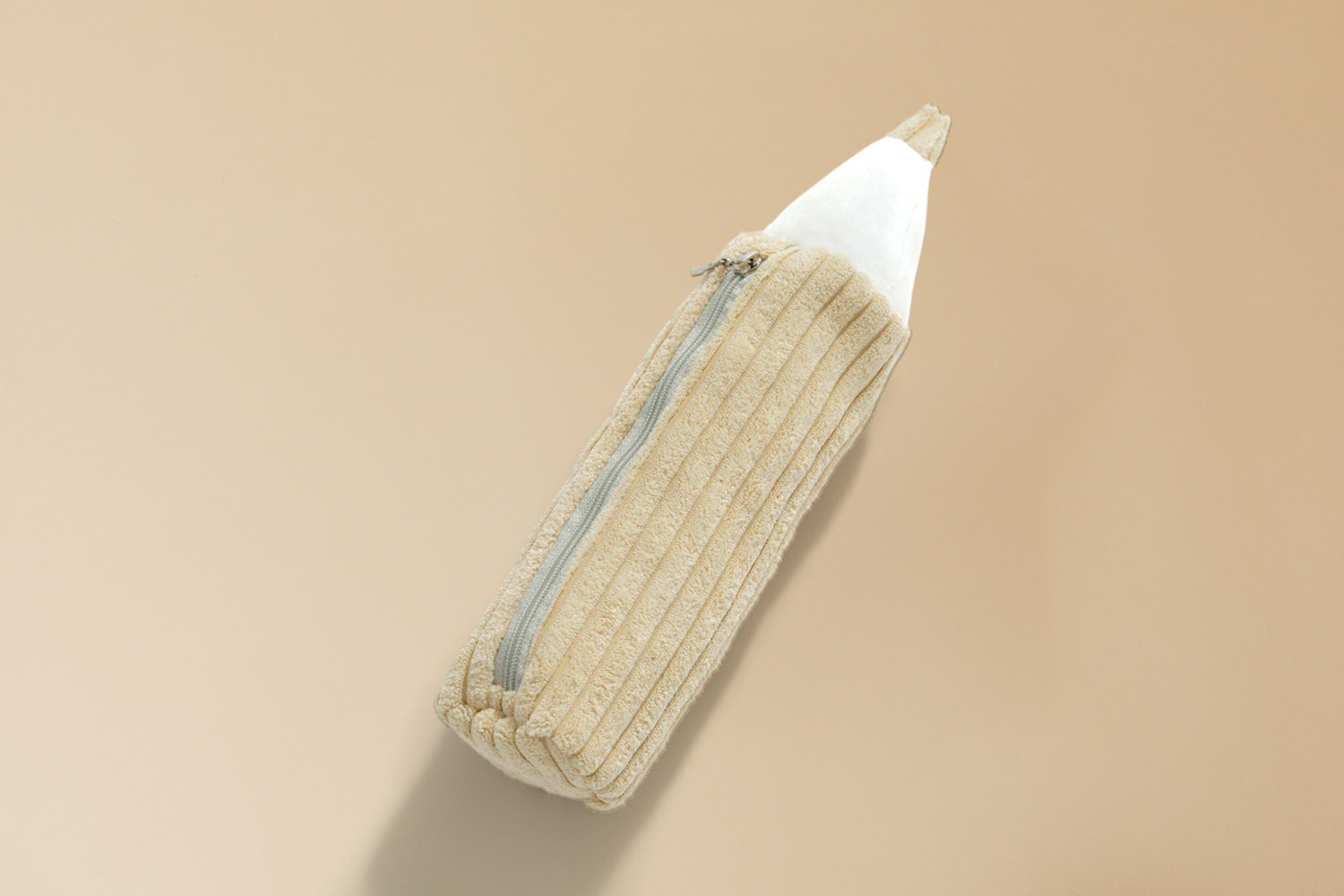 Une trousse amusante en forme de crayon, fabriquée en velours côtelé doux avec une fermeture éclair.