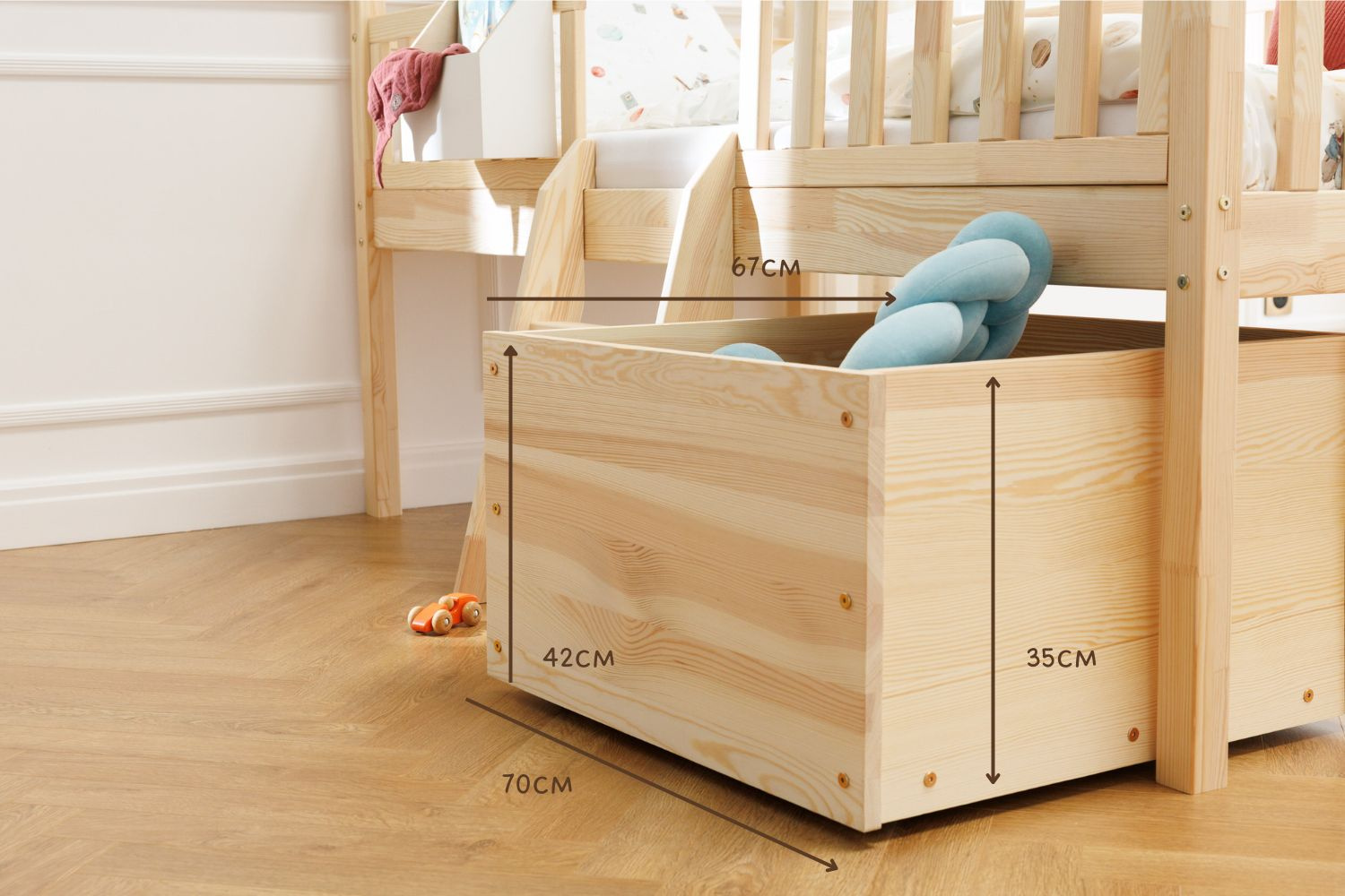 Conçue pour se glisser directement sous le lit, elle propose un volume de rangement idéal pour les jouets, les livres, le linge ou les accessoires du quotidien. Sa structure en bois naturel non traité s’harmonise parfaitement avec nos lits et apporte une touche douce et chaleureuse à la chambre.