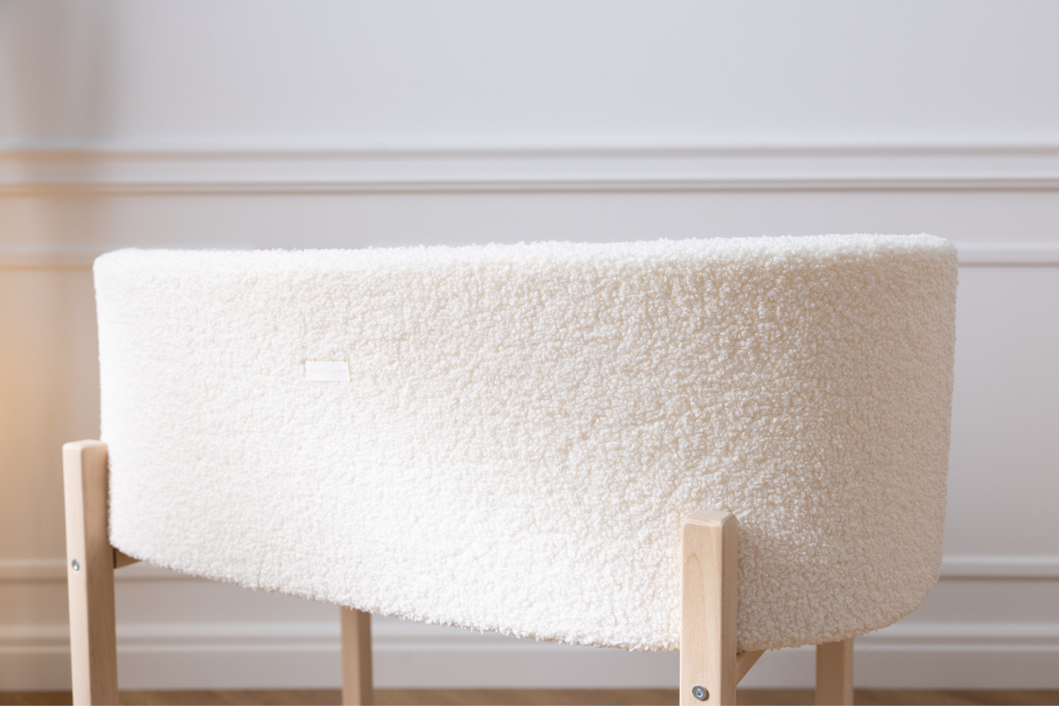 L’intérieur du couffin est réalisé en jersey de coton blanc, le rembourrage est en mousse, et l’extérieur est fabriqué en tissu Teddy (bouclé).