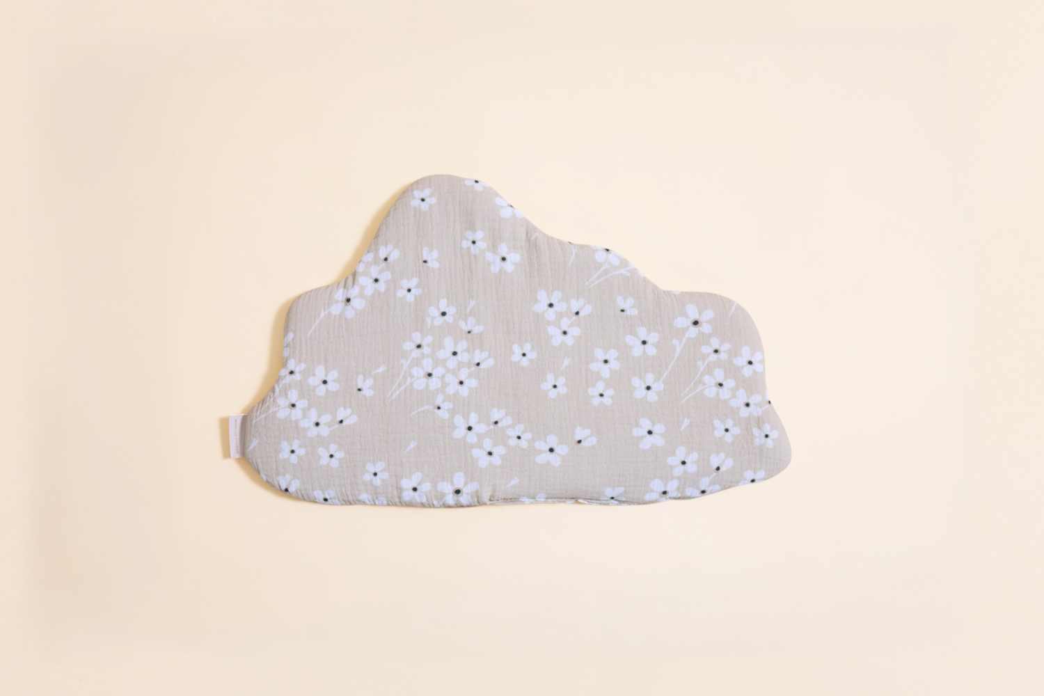 Oreiller plat en forme de nuage pour bébé, fabriqué en douce mousseline de coton. Le rembourrage anti-allergique assure confort et sécurité. Parfait pour les lits, poussettes et les voyages. Entièrement lavable en machine.