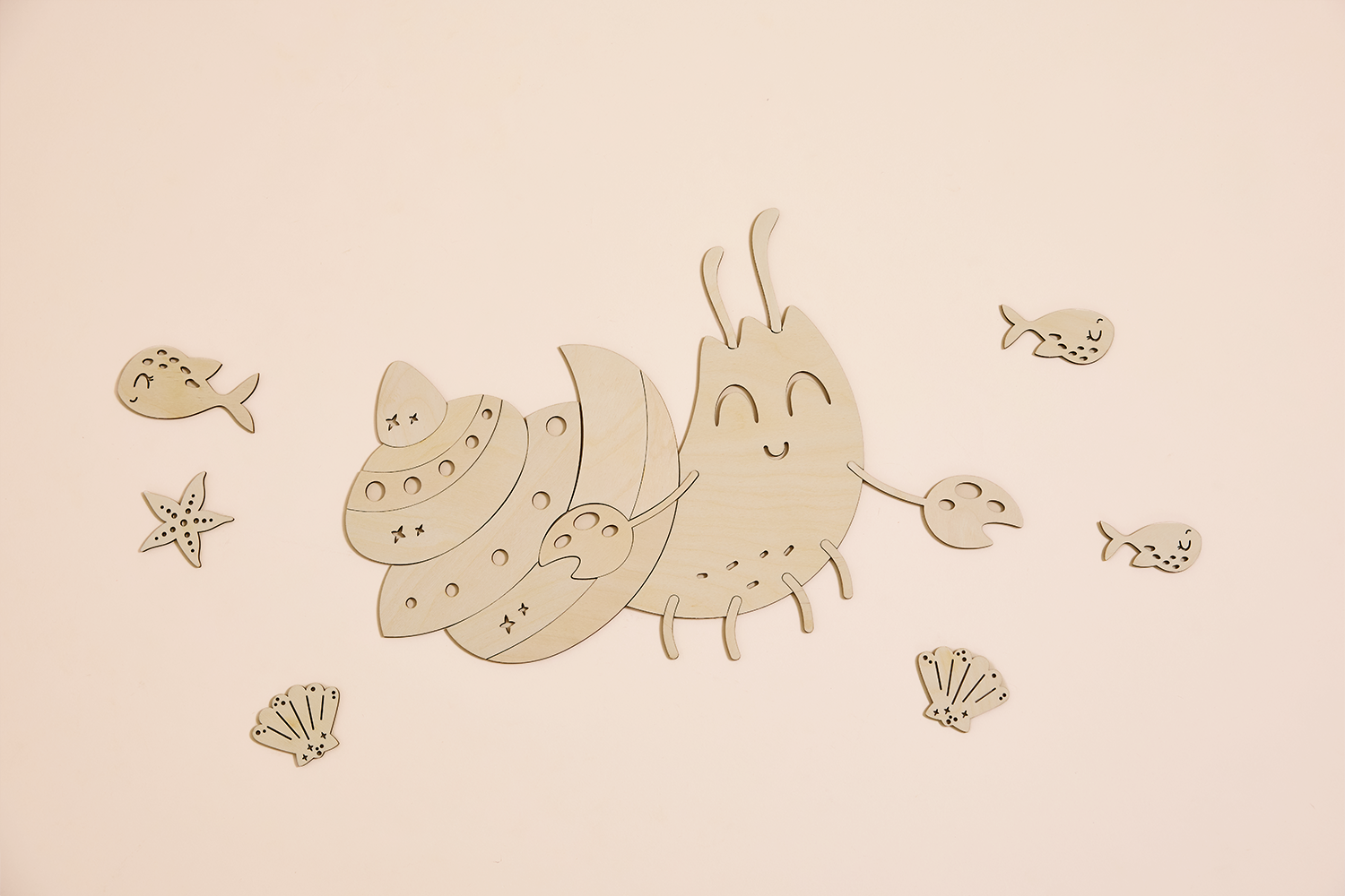 5 à 7 éléments en bois supplémentaires sur le thème de la mer : poissons, coquillages, étoiles de mer.