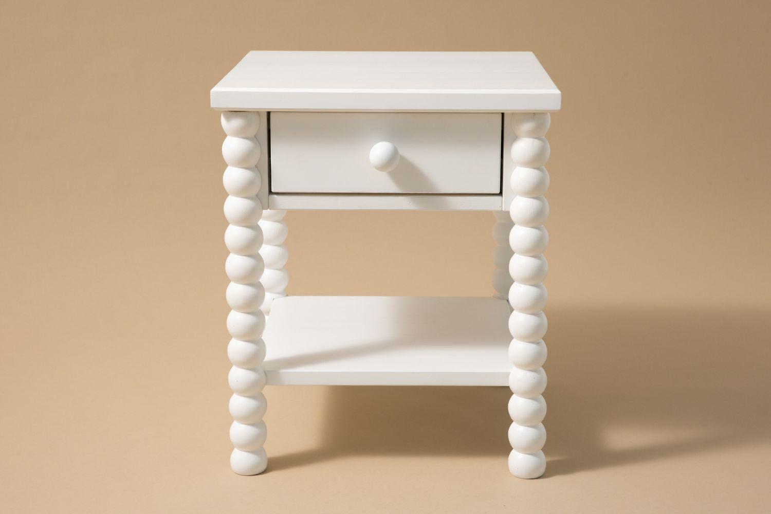 Apportez une touche de douceur et de modernité à la chambre de votre enfant avec la table de chevet Perlés. Son design à deux niveaux comprend un plateau supérieur pour poser une lampe et un tiroir pratique pour ranger livres, jouets ou petits objets du quotidien. Les pieds perlés apportent une élégance unique et un style raffiné à la pièce.