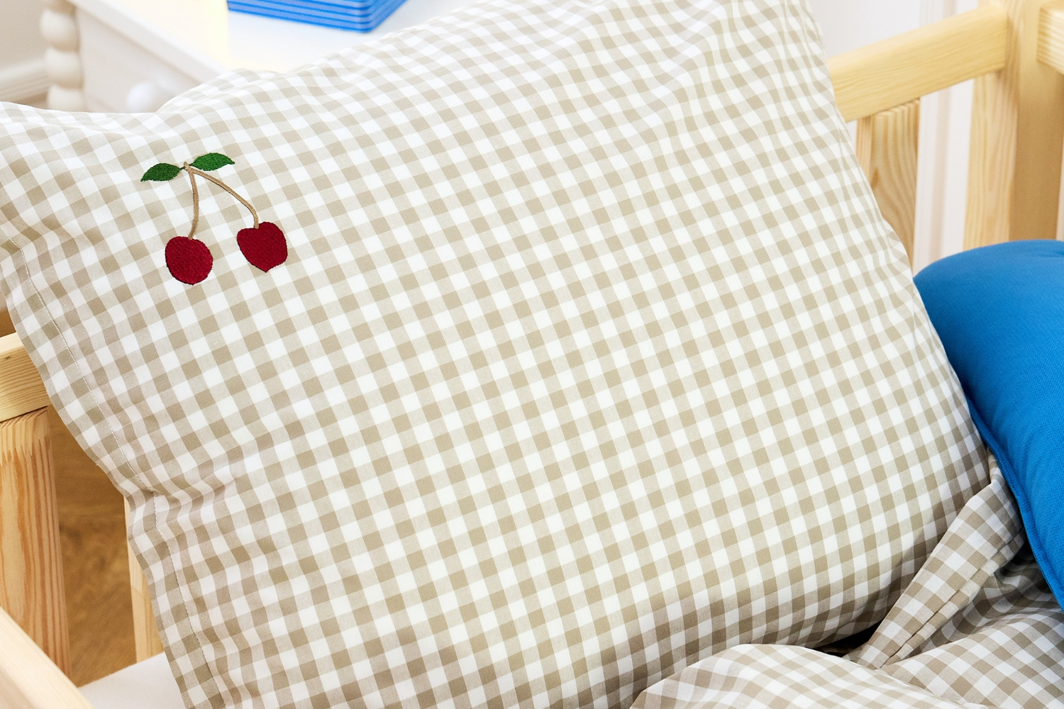 Notre charmante parure de lit à carreaux en coton pour enfants, ornée d'une délicate broderie de cerise, est fabriquée avec du coton de la plus haute qualité.