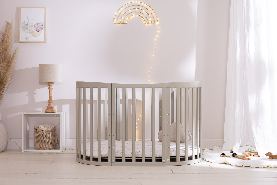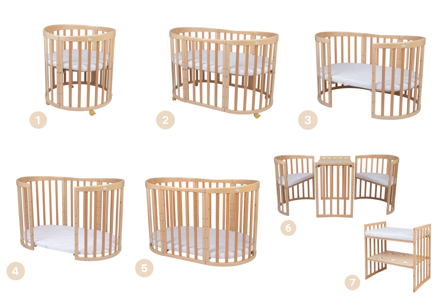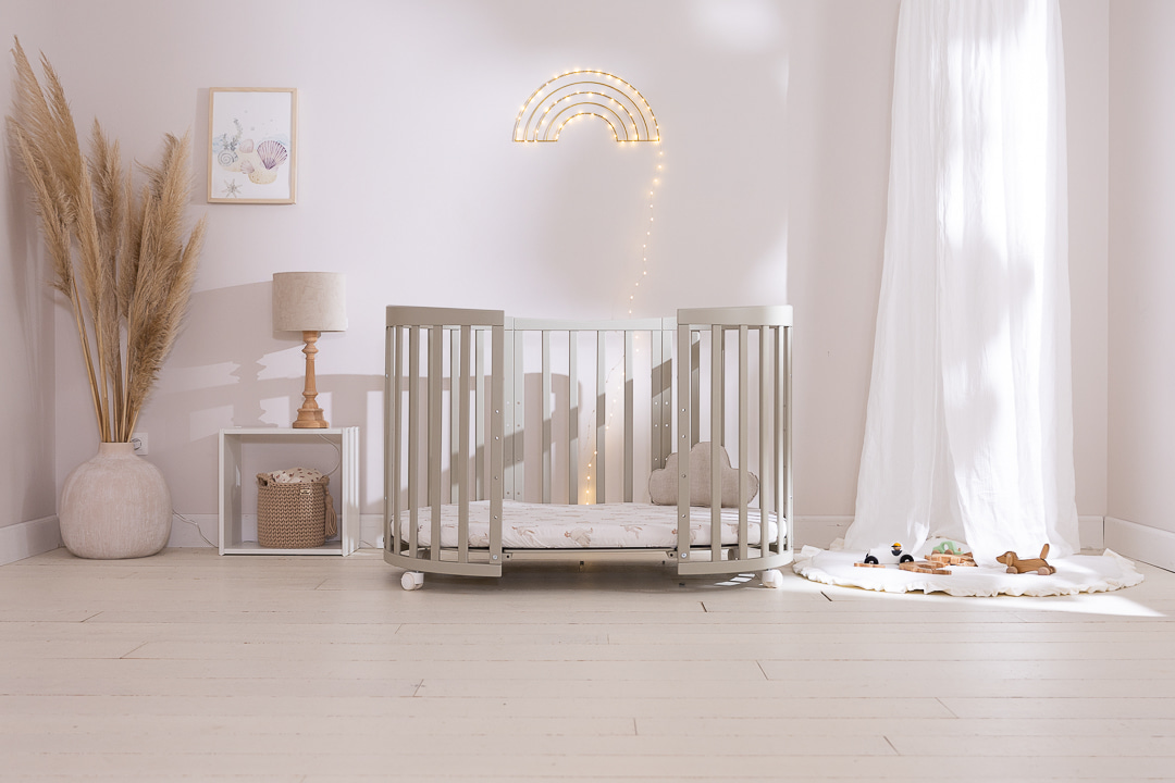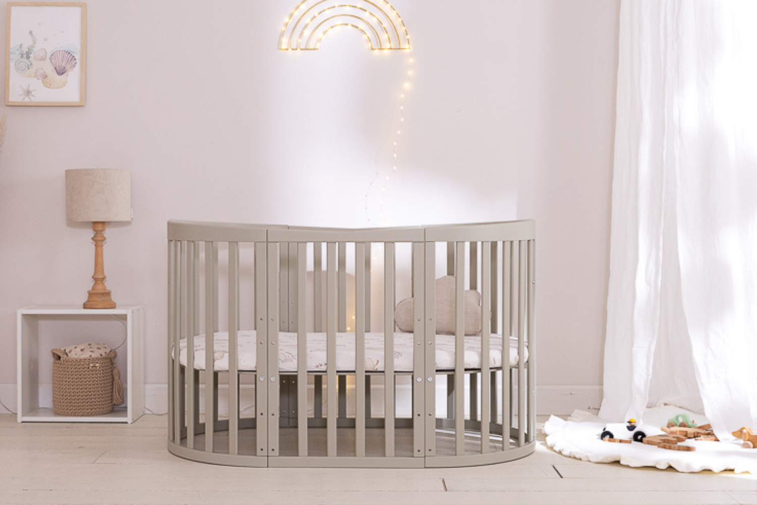 Le lit bébé ovale 7en1 est pratique, élégant et résistant.