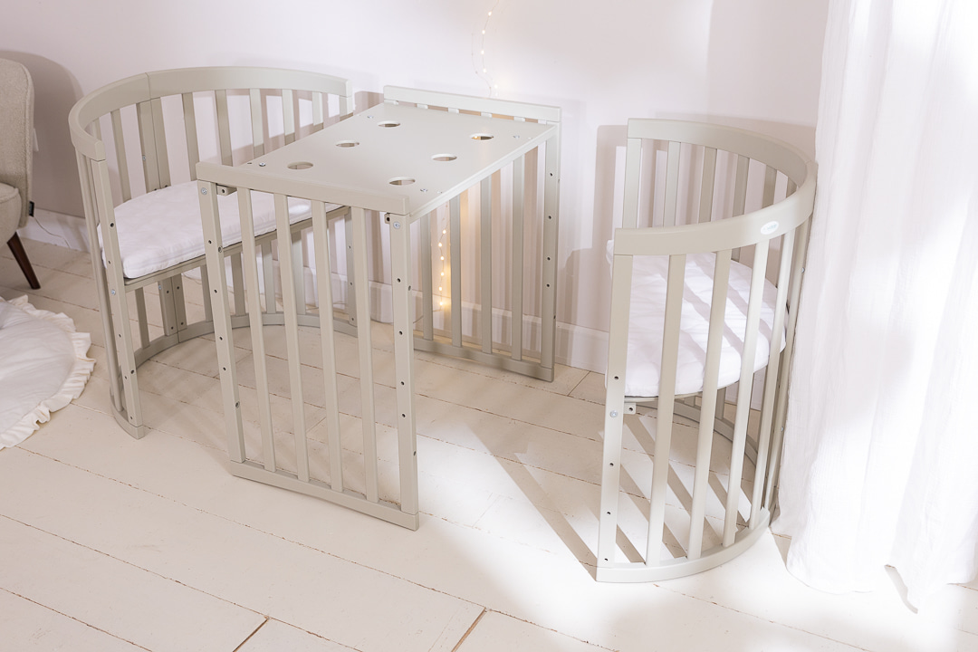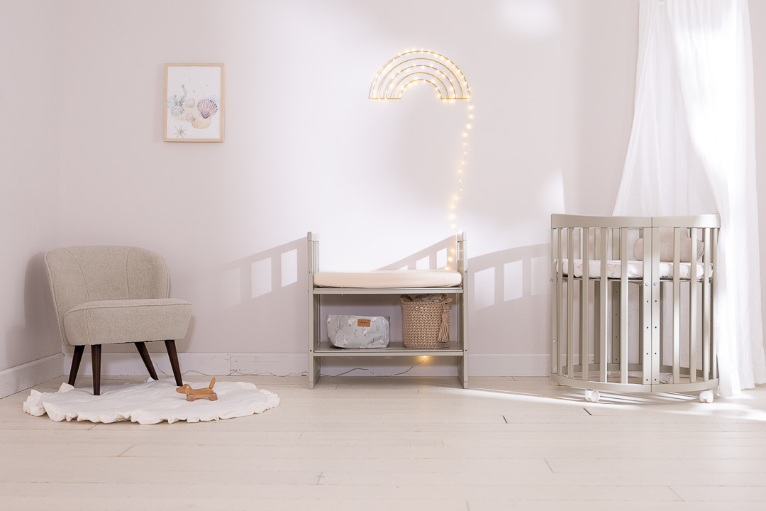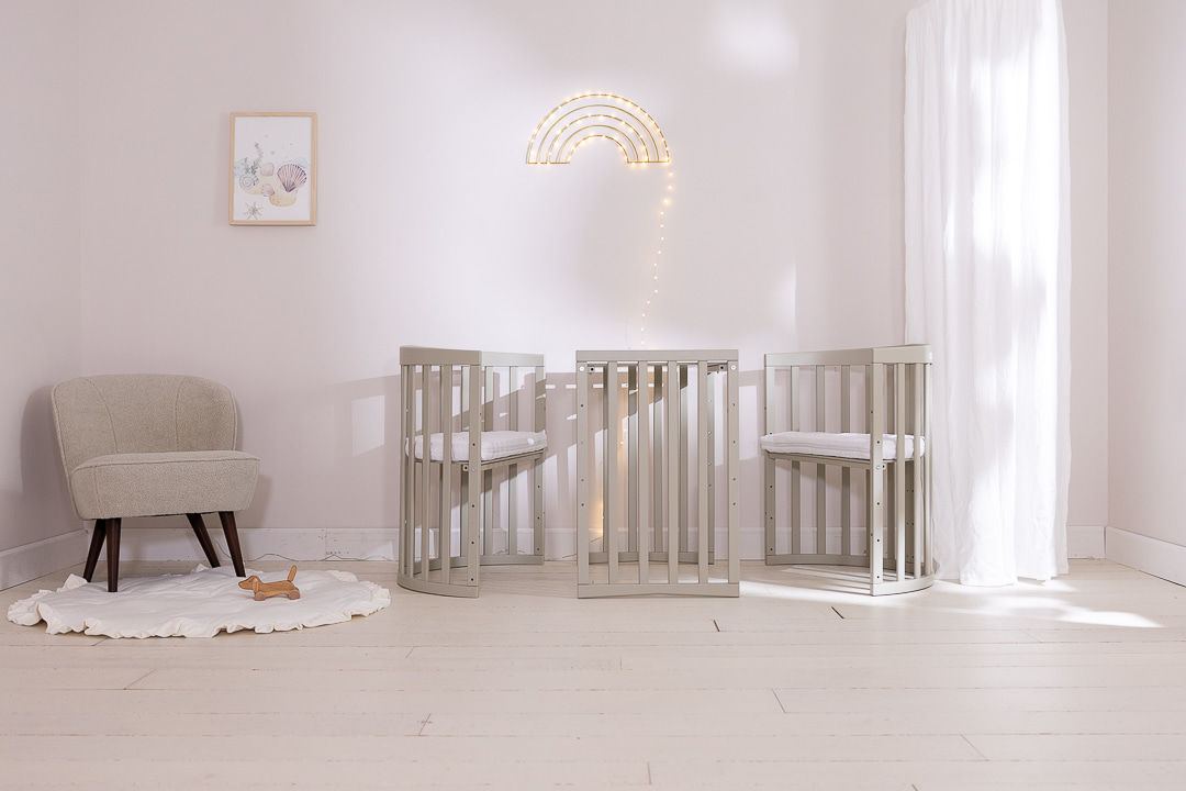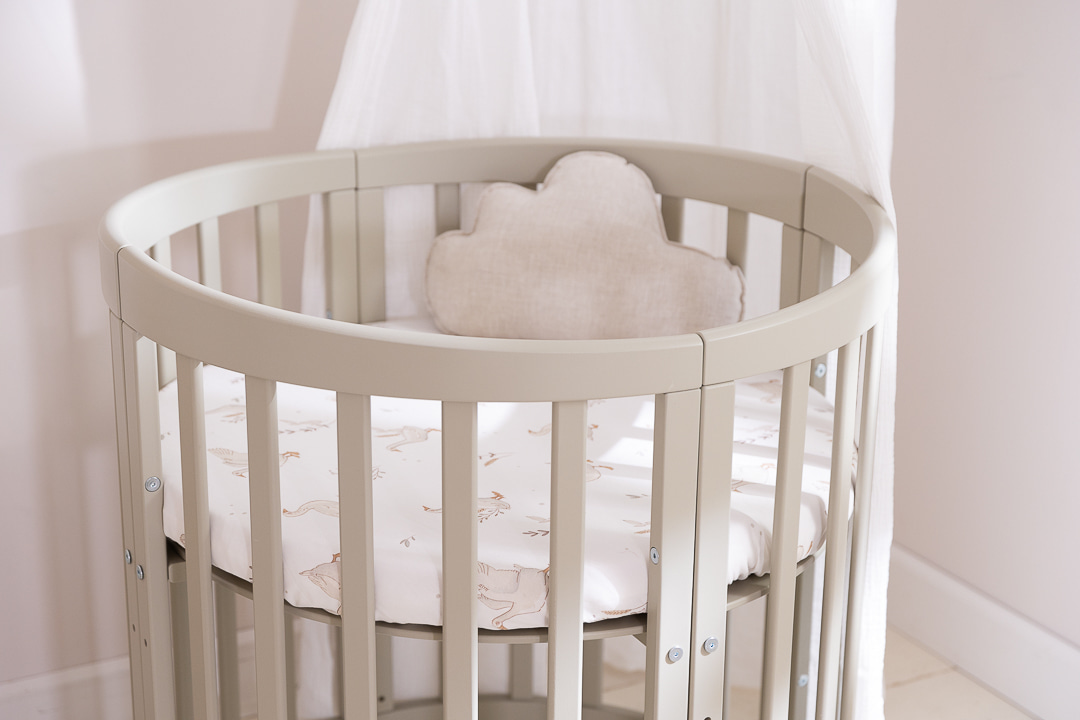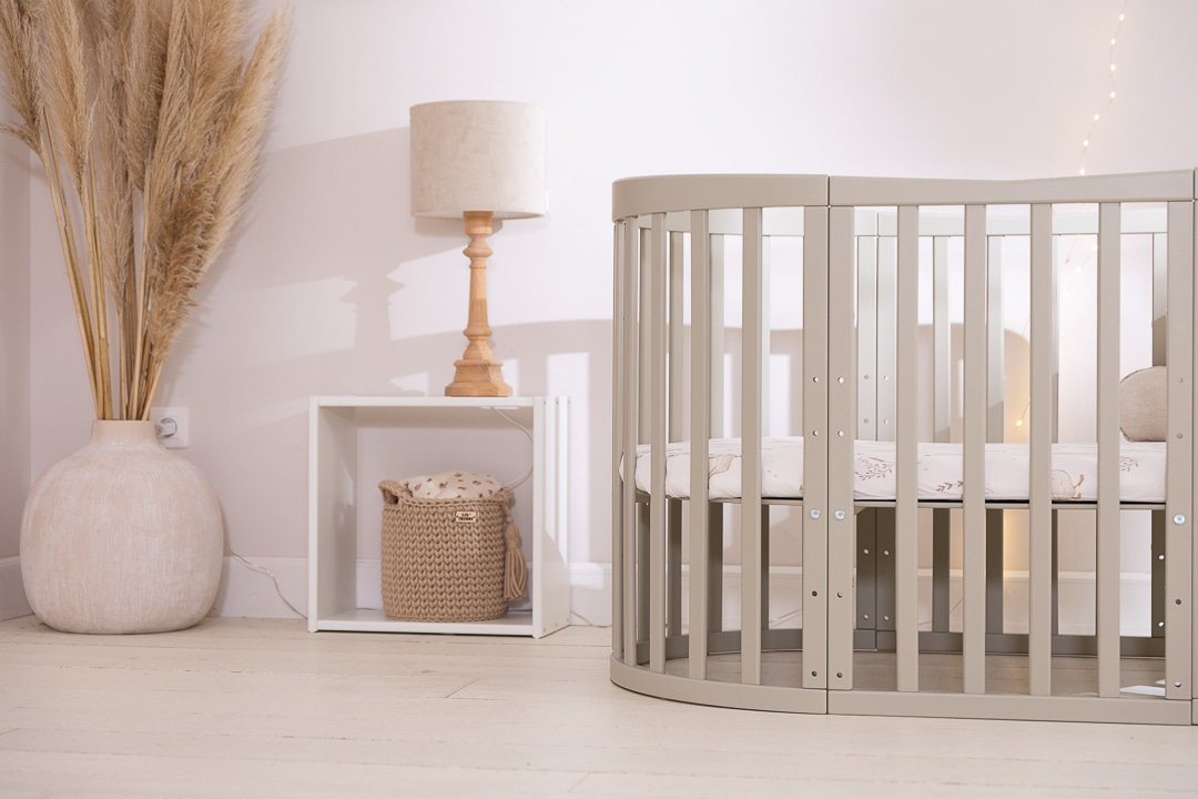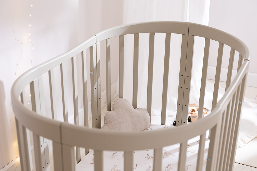 Le lit bébé ovale 7en1 est pratique, élégant et résistant.