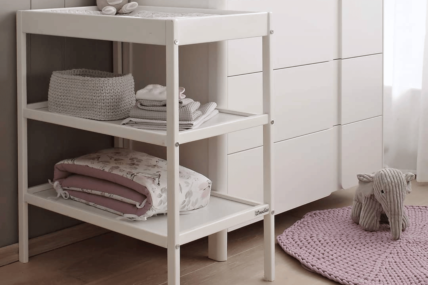 Le plateau supérieur est utilisé pour le change et les étagères inférieures contiennent tous les produits essentiels nécessaires à un enfant. Les étagères de la table à langer sont placées à la hauteur optimale pour ranger les couches, les dormeuses et les jouets, sans se pencher inutilement.